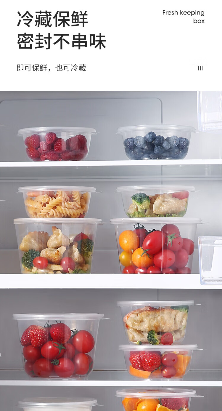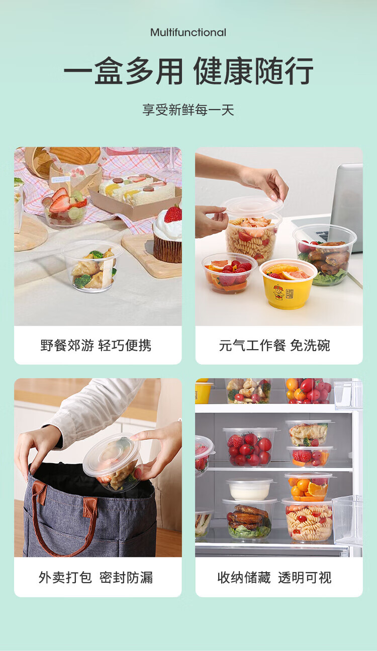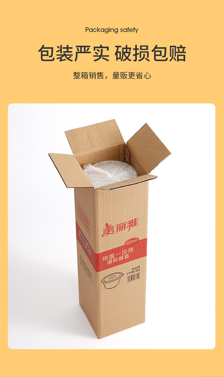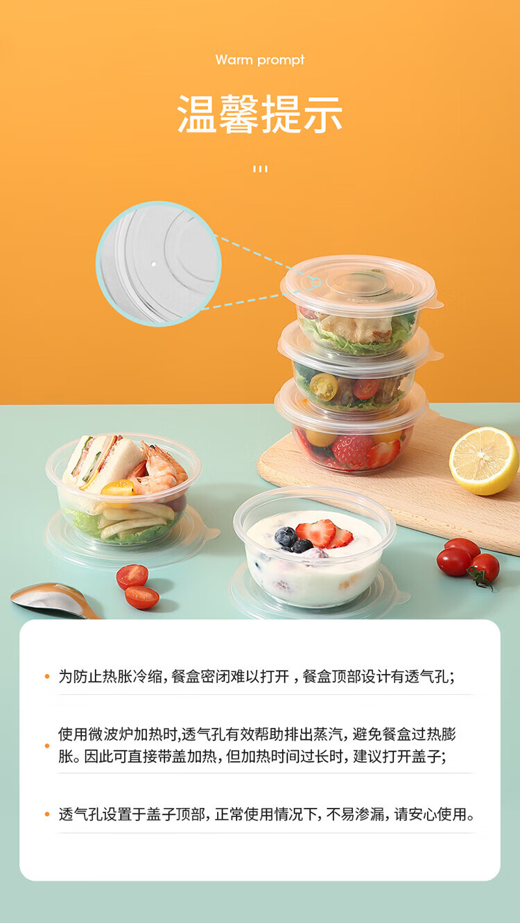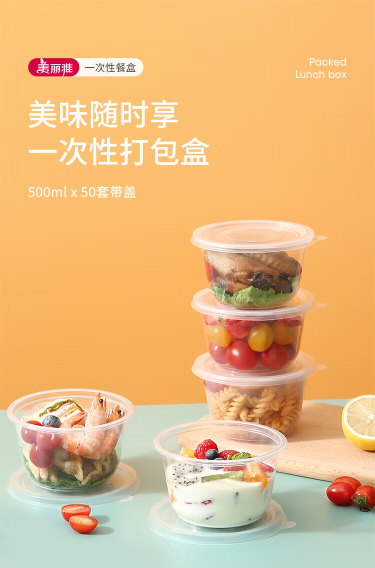 Meiya disposable lunch boxes 500ml*50 sets of food-grade packed lunch boxes with lids, round bowls, microwaveable