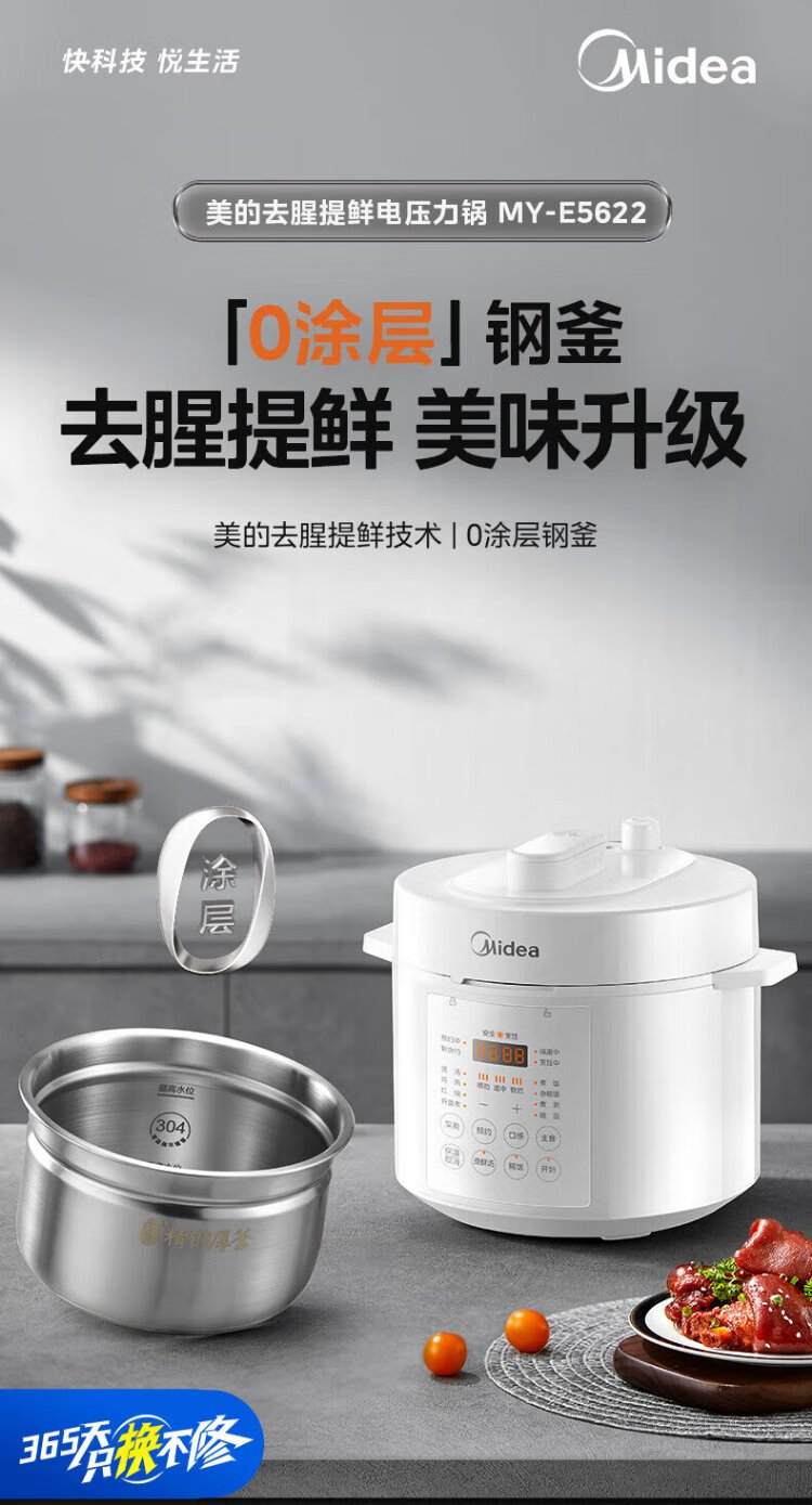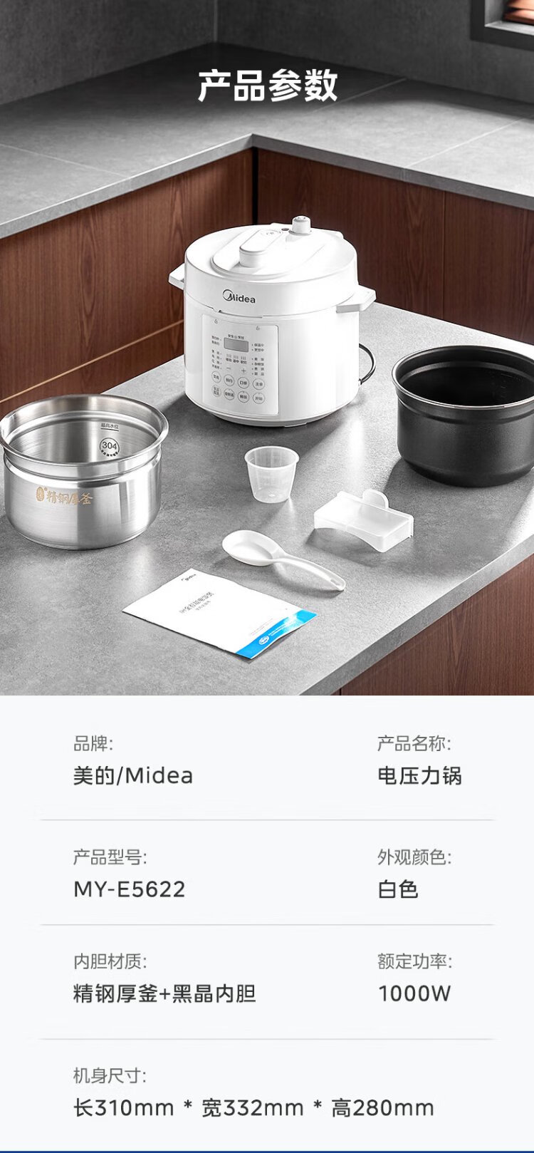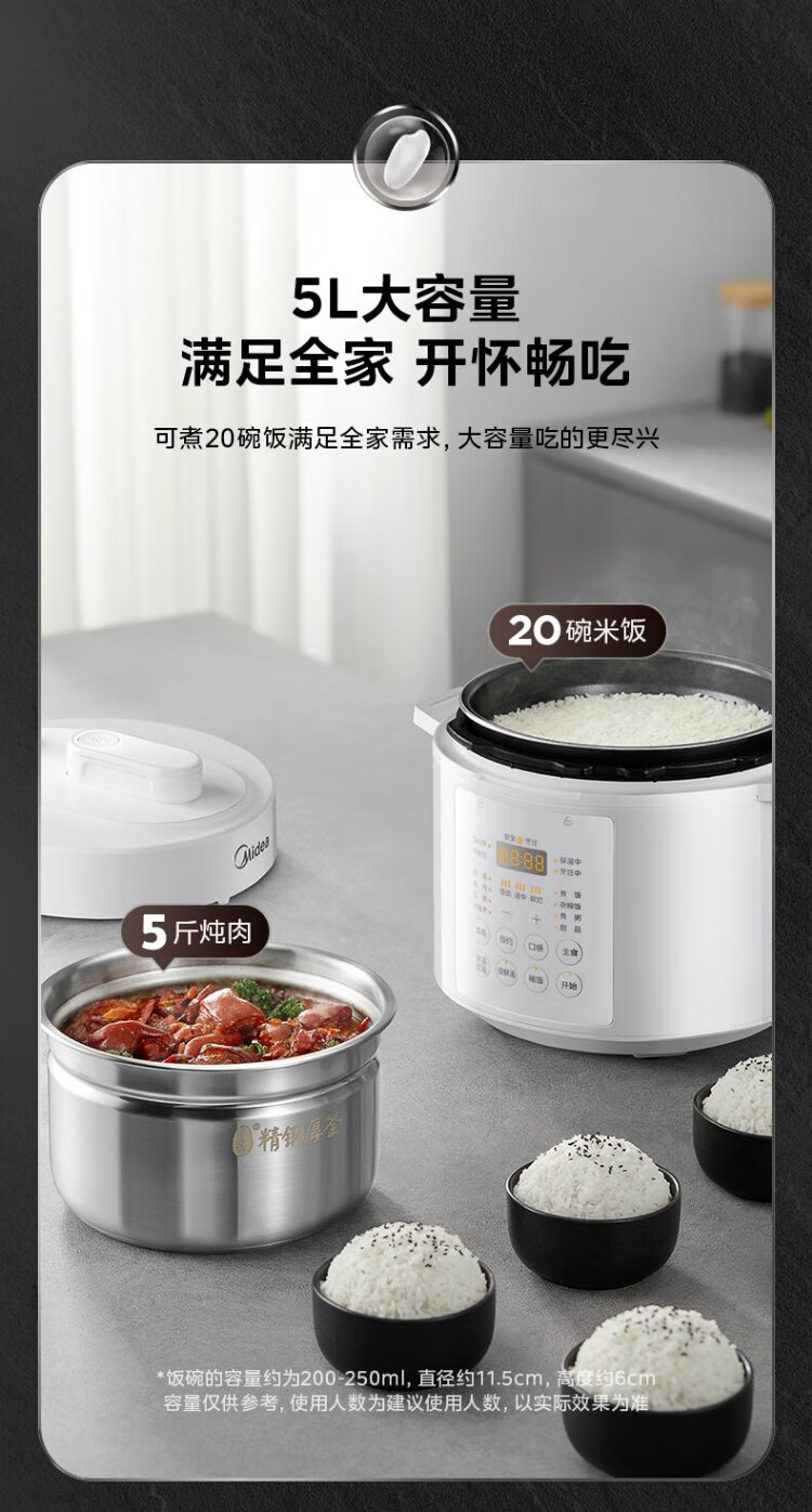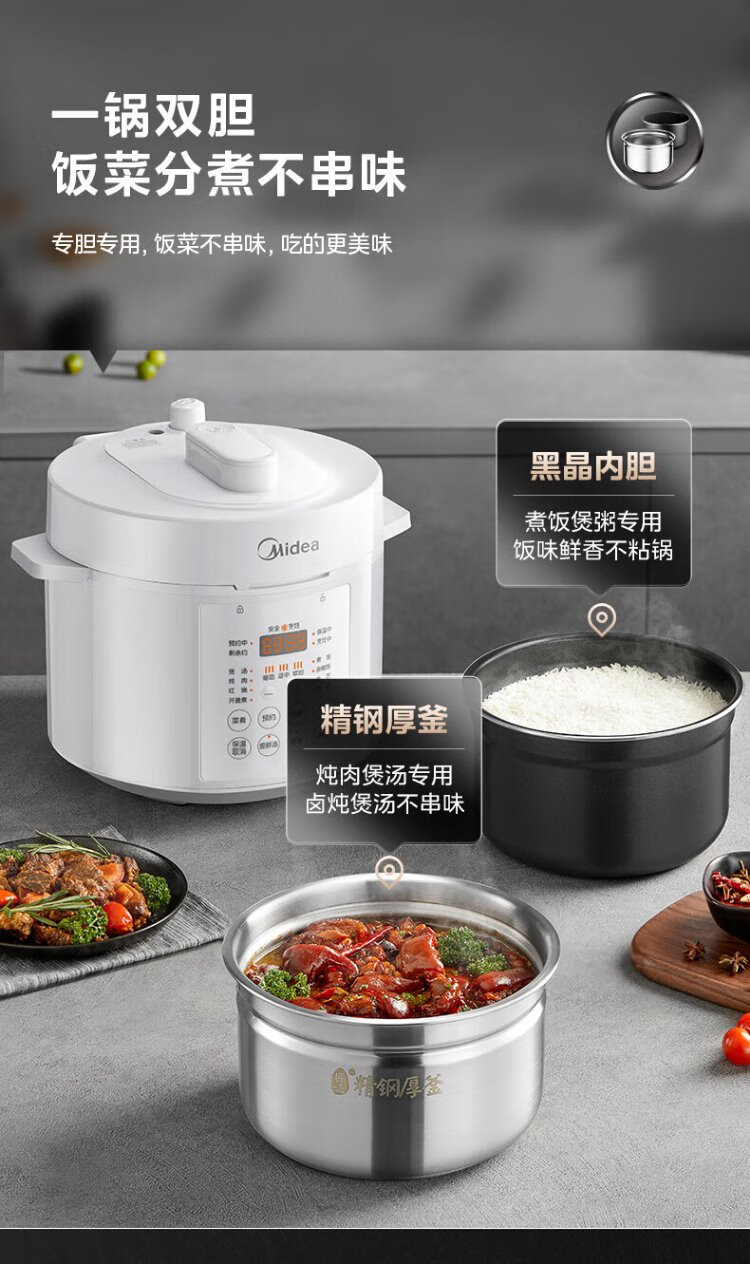 Midea National Subsidy 0-Coating Electric Pressure Cooker 5L Dual-Bile Household Use for 4-6 People Fully Automatic Intelligent Reservation Open-Lid Hot Pot MY-E5622 Rice Cooker Pressure Cooker