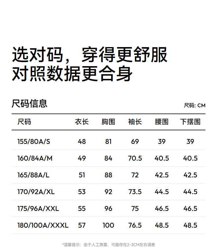 China (cm) 160-165/84-86 165-170 / 88-90 167-172 / 92-96 168-173 / 98-102 170-176 / 106-110