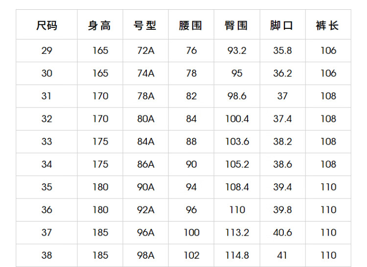 China (cm) 160-165/84-86 165-170 / 88-90 167-172 / 92-96 168-173 / 98-102 170-176 / 106-110