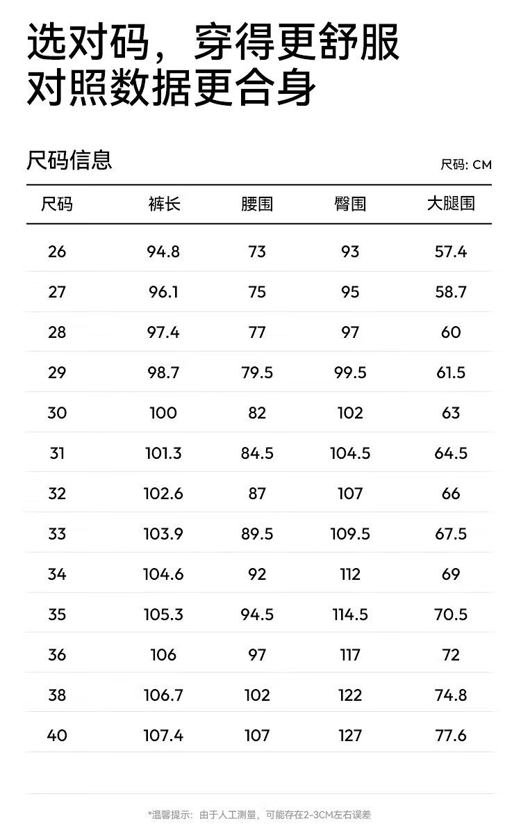 Outseam (cm) 99 cm 101.5 cm 104 cm 106.5 cm 109 cm