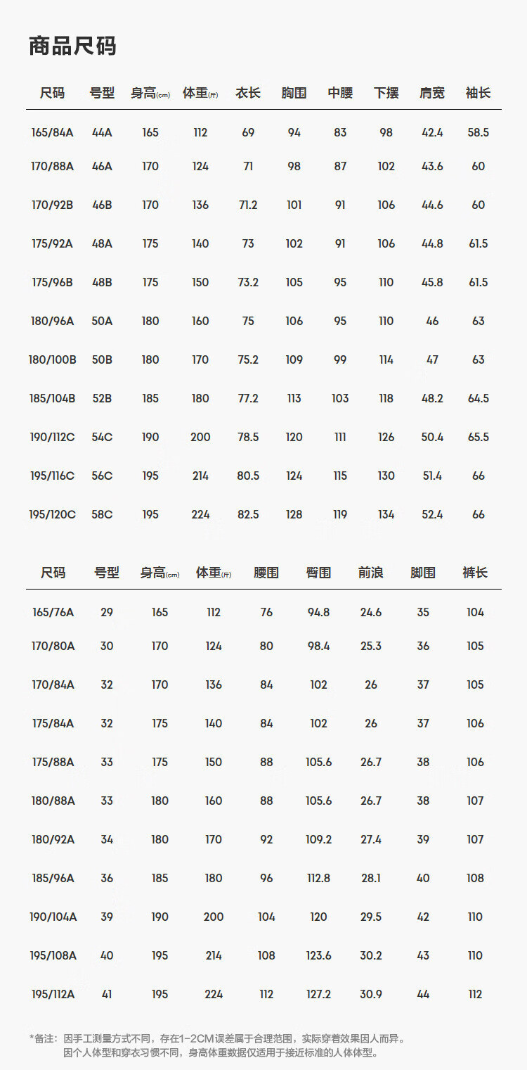 China (cm) 160-165/84-86 165-170 / 88-90 167-172 / 92-96 168-173 / 98-102 170-176 / 106-110