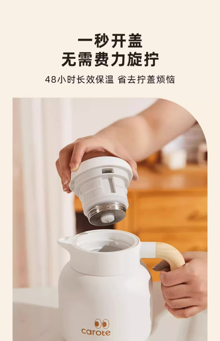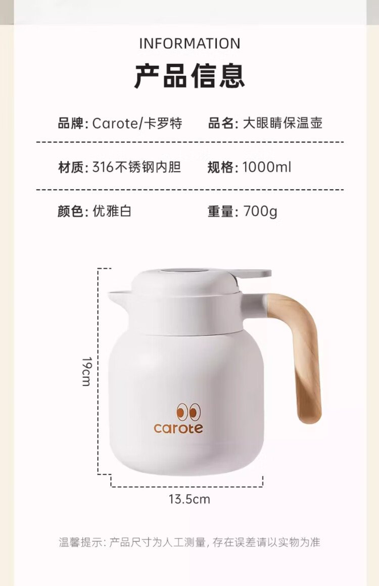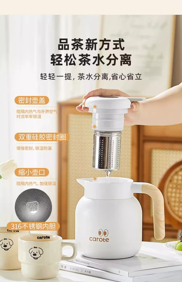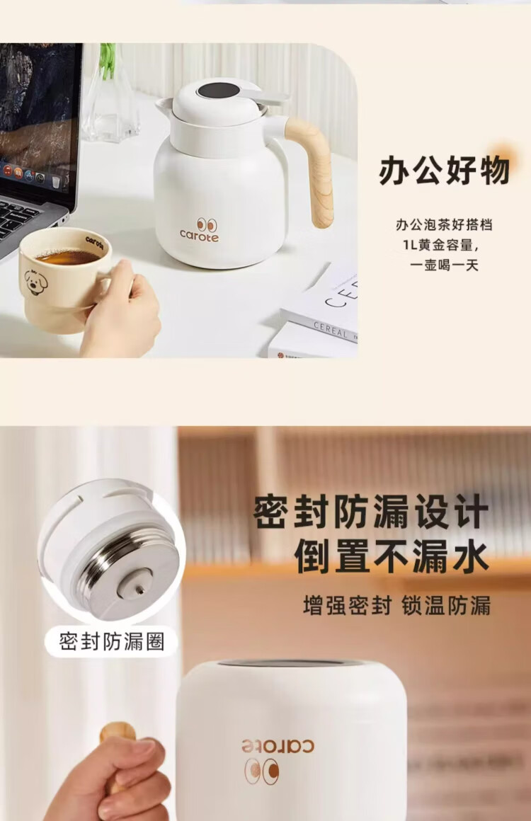 CaROTE thermos kettle household stainless steel warm kettle stuffy bubble kettle large capacity office stew teapot 1L with tea warehouse