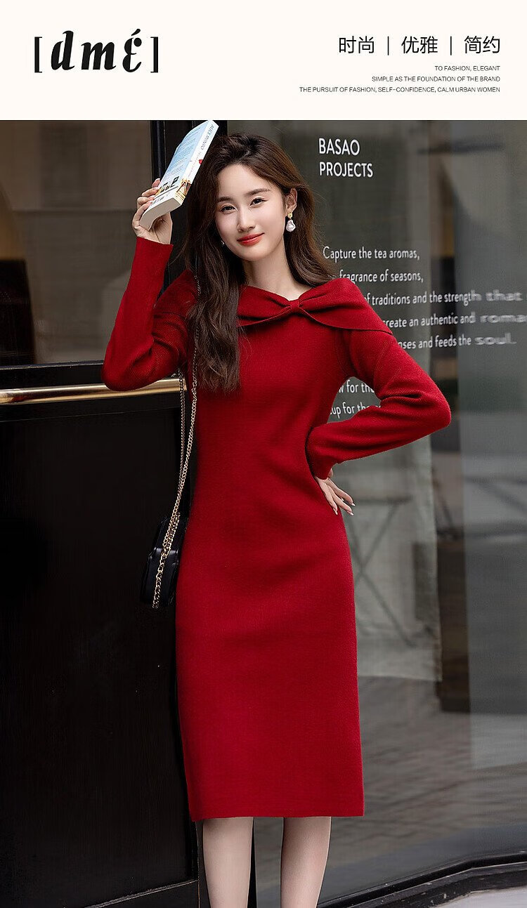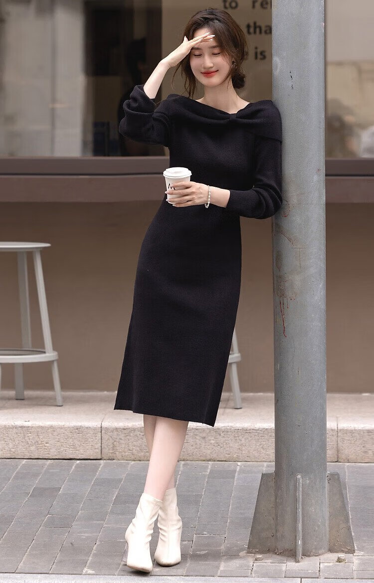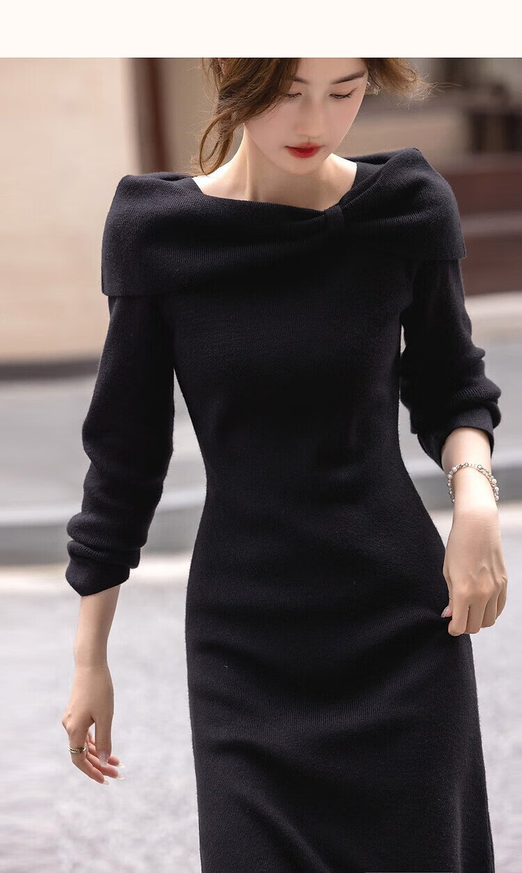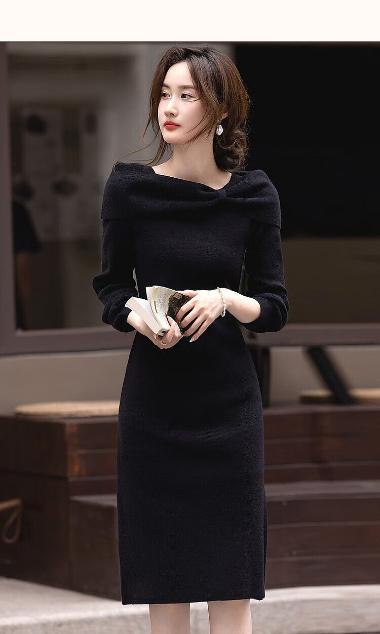 Demana Kim Secretary Outfit Autumn and Winter French Intellectual Little Woman Butterfly One-Neck Knitted Mid-Length Women's Dress