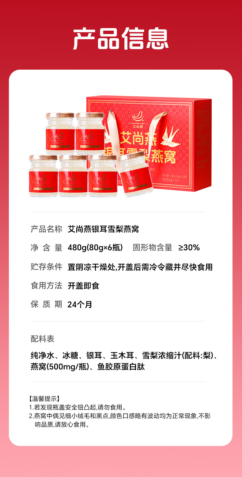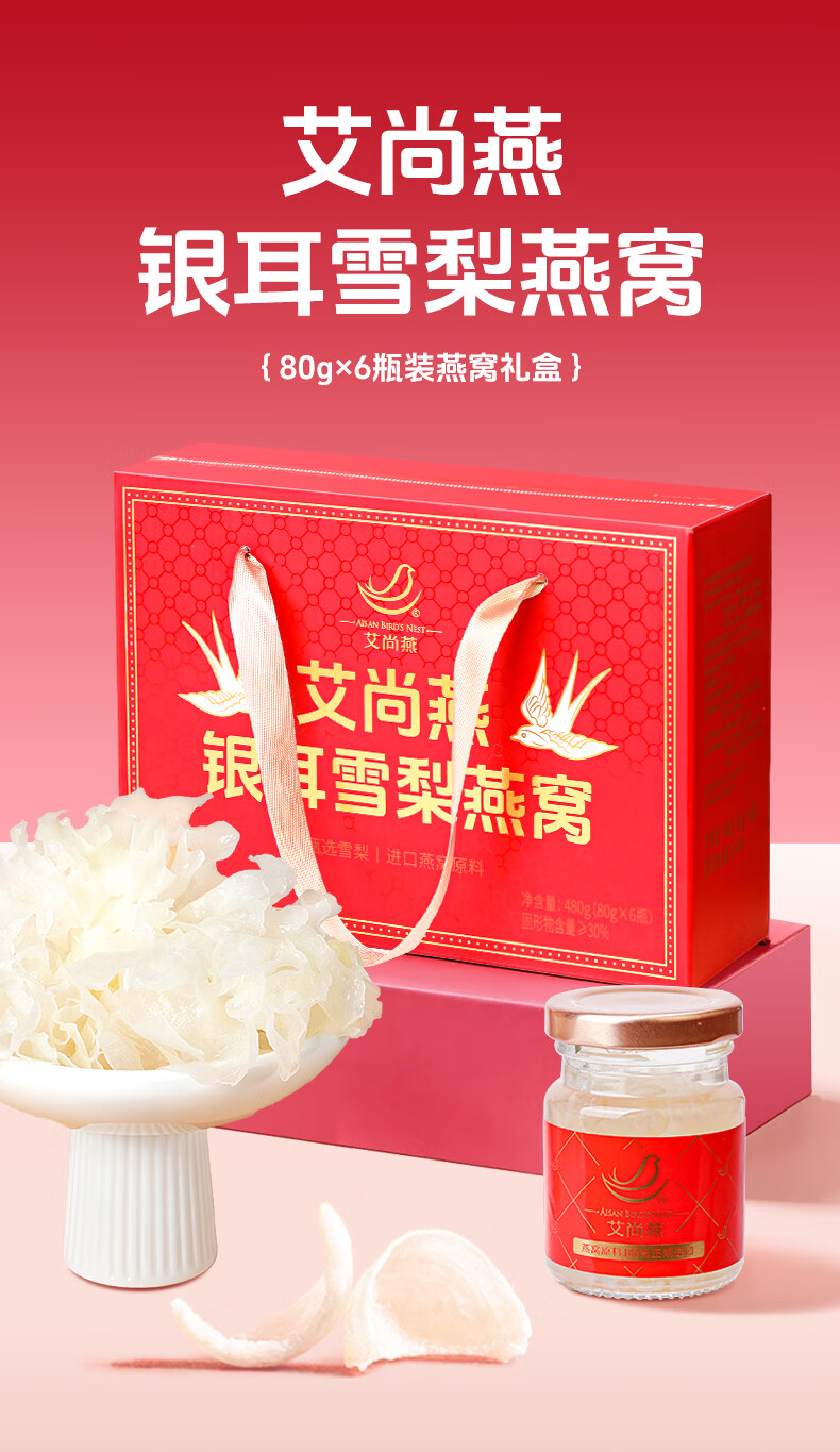 Aishangyan ready-to-eat bird's nest gift box 80g*6 bottles pregnant women's supplements gifts for parents and elders nutritional supplements birthday gifts