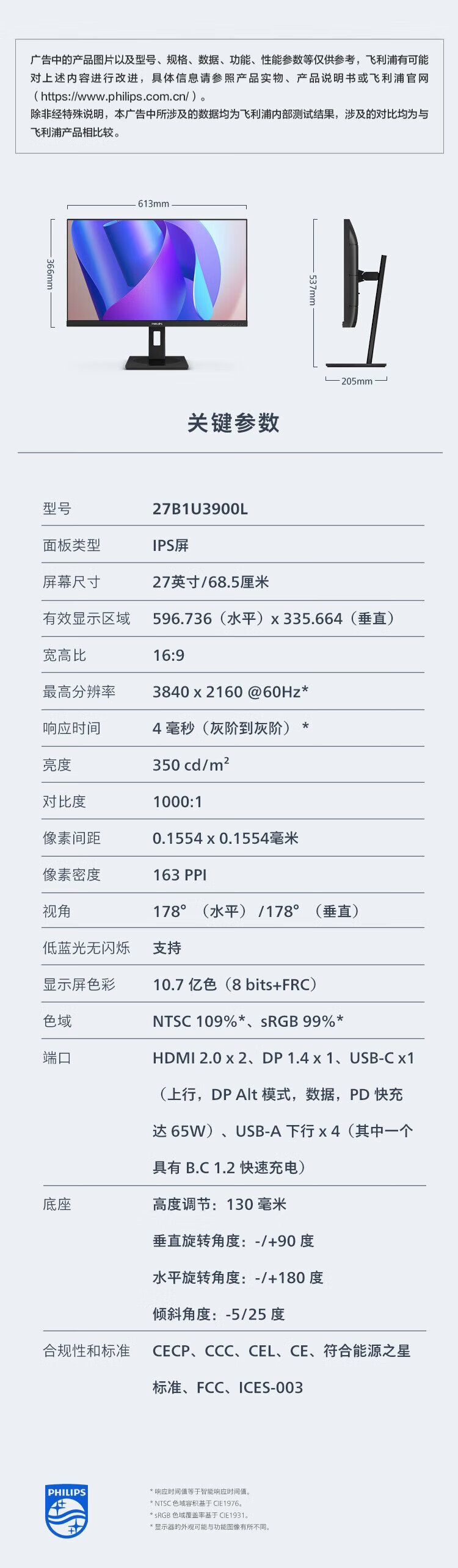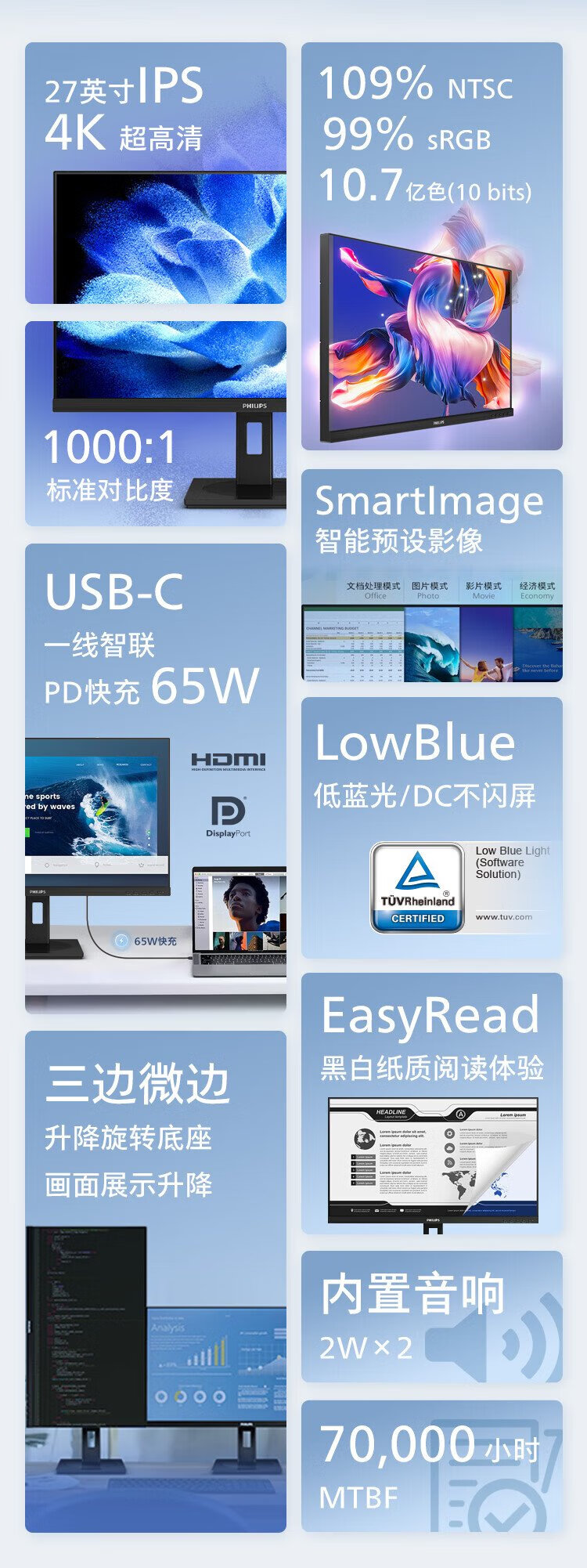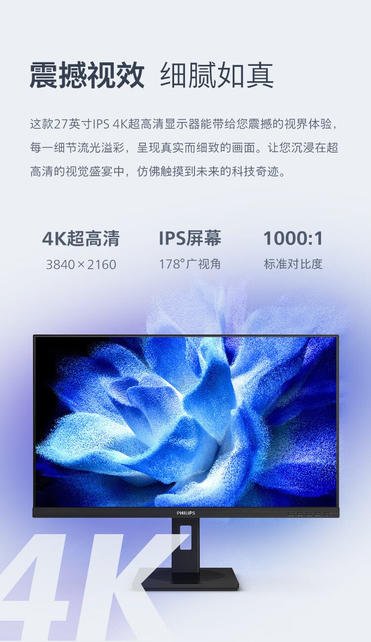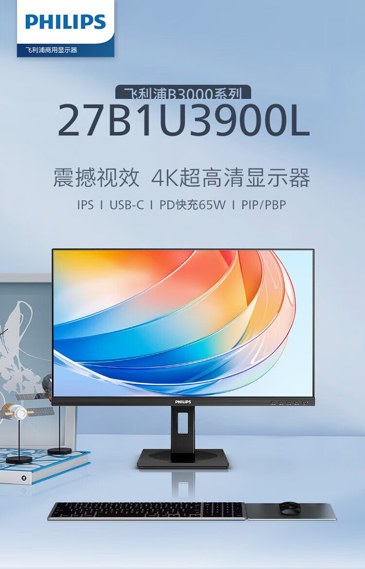Philips (PHILIPS) 27-inch 4K monitor IPS Type-C65W built-in speaker low blue light rotating lift PBP split screen office computer display 27B1U3900L