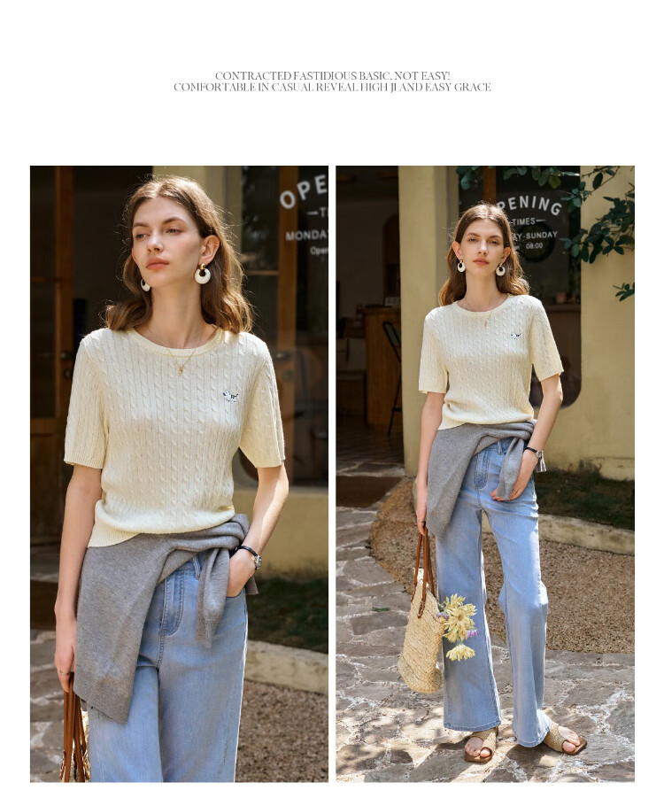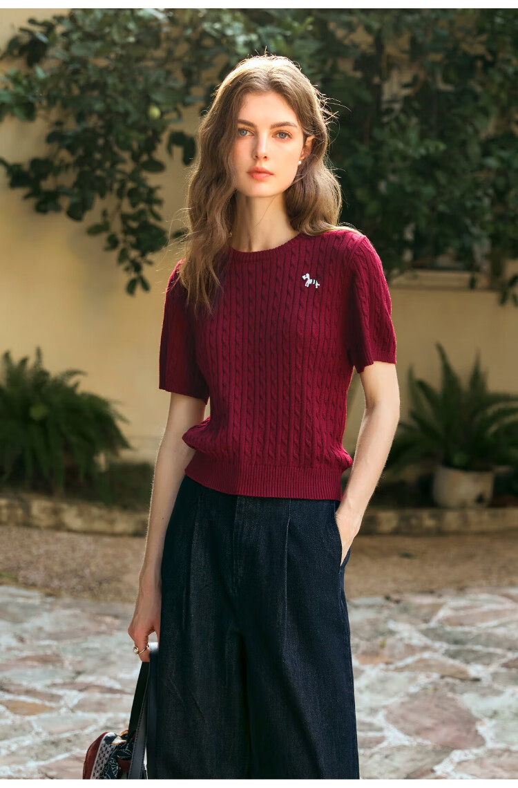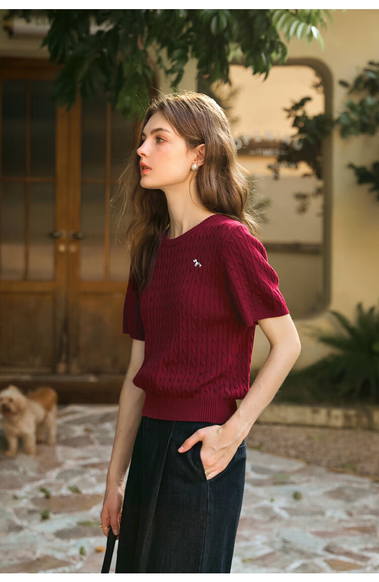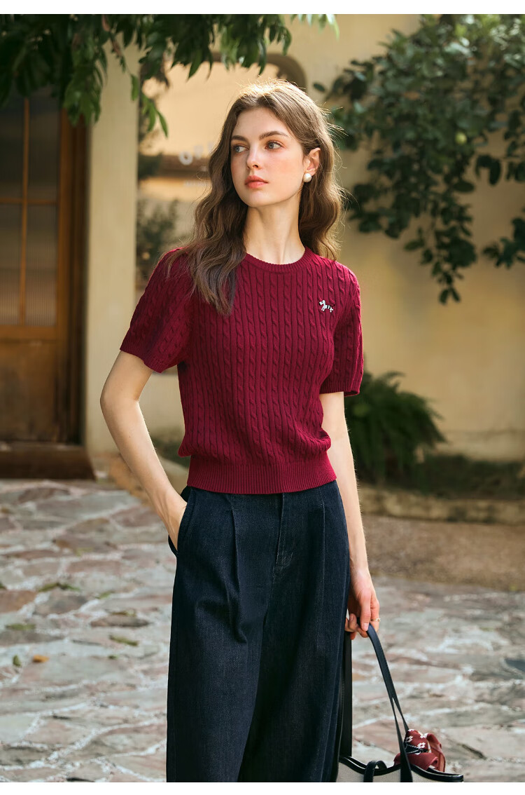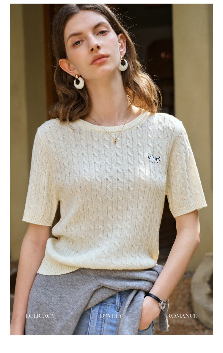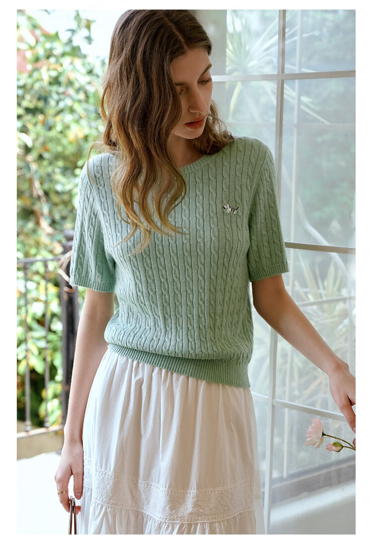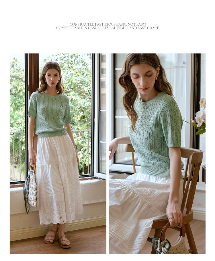Olrain French short-sleeved T-shirt women's spring 2025 commuting round neck knitted pullover Ancora M