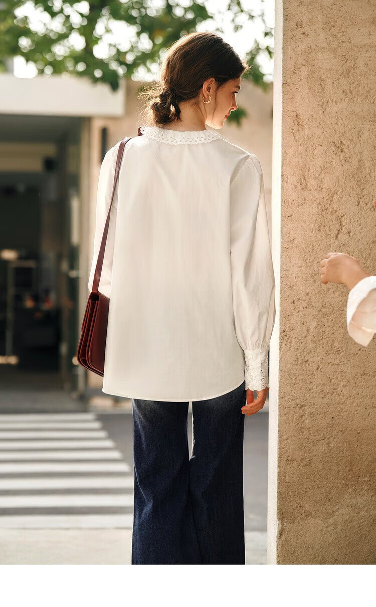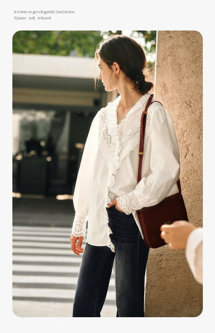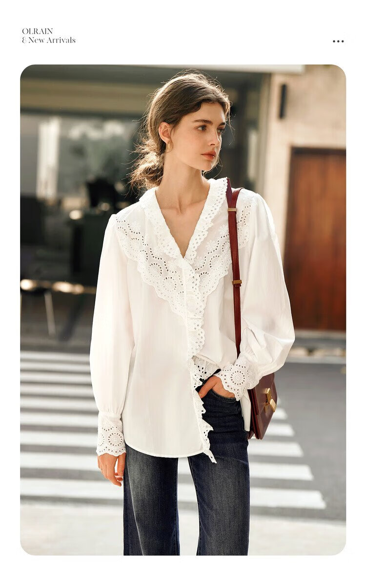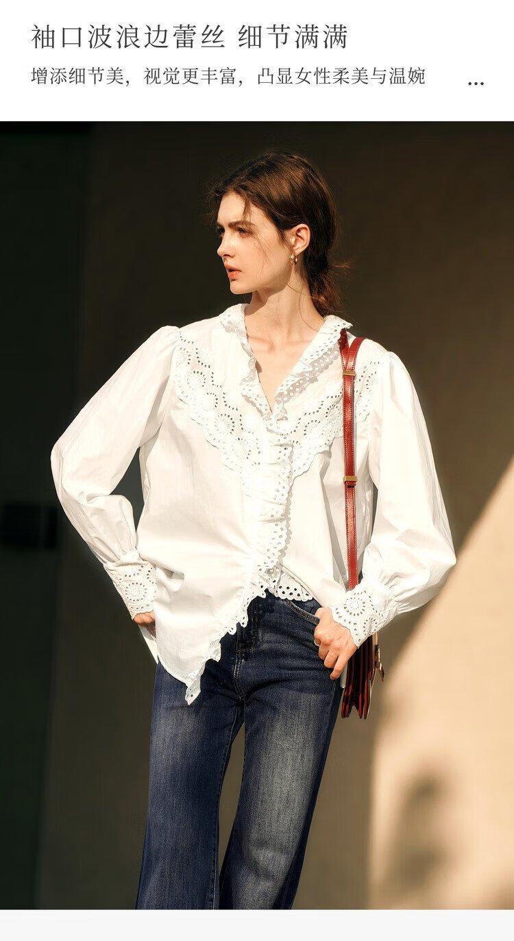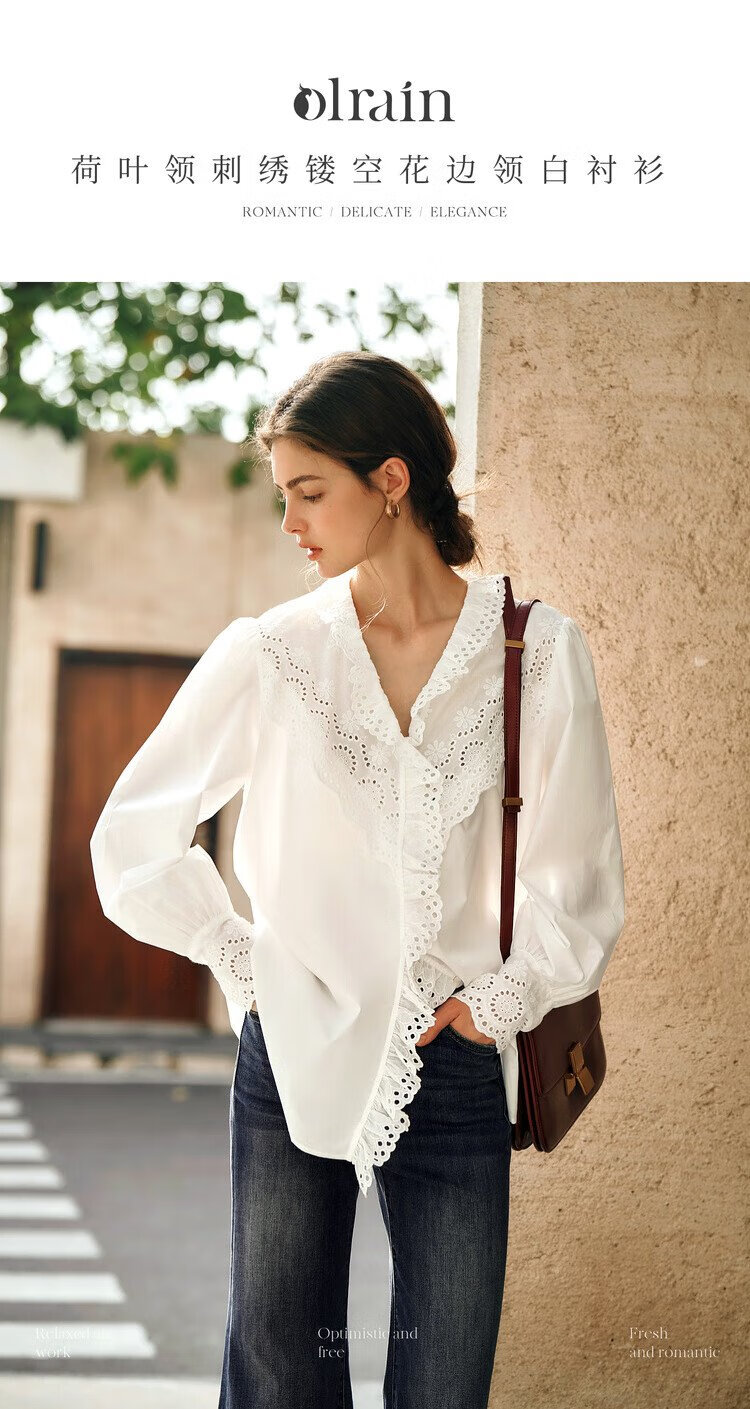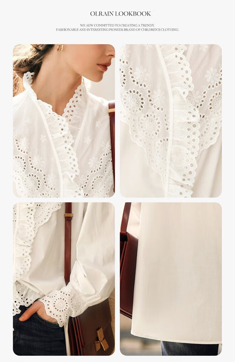 Olrain French white shirt spring and autumn women's lotus leaf collar embroidered hollow shirt temperament commuting white S
