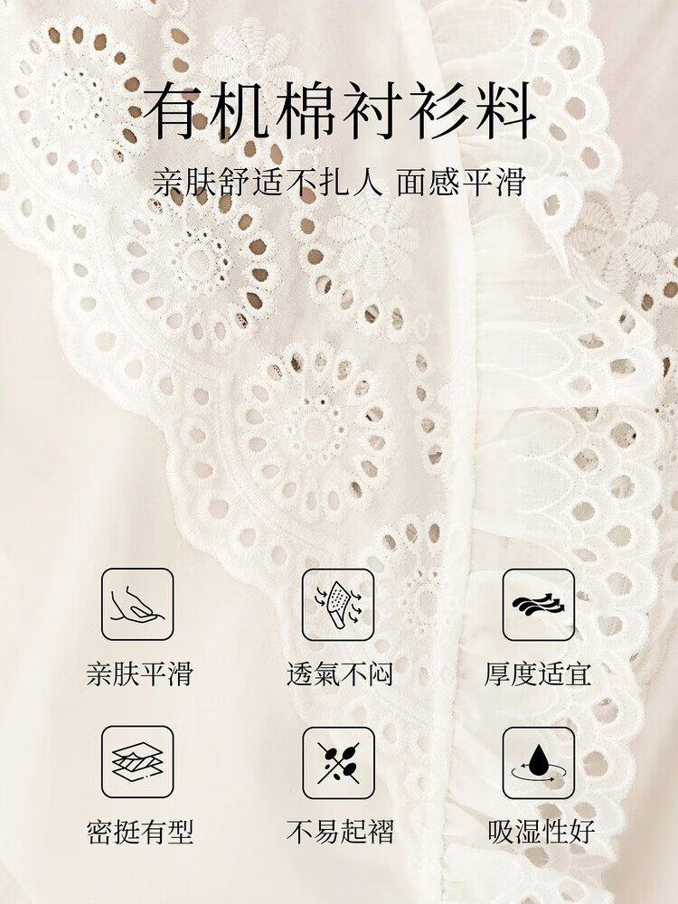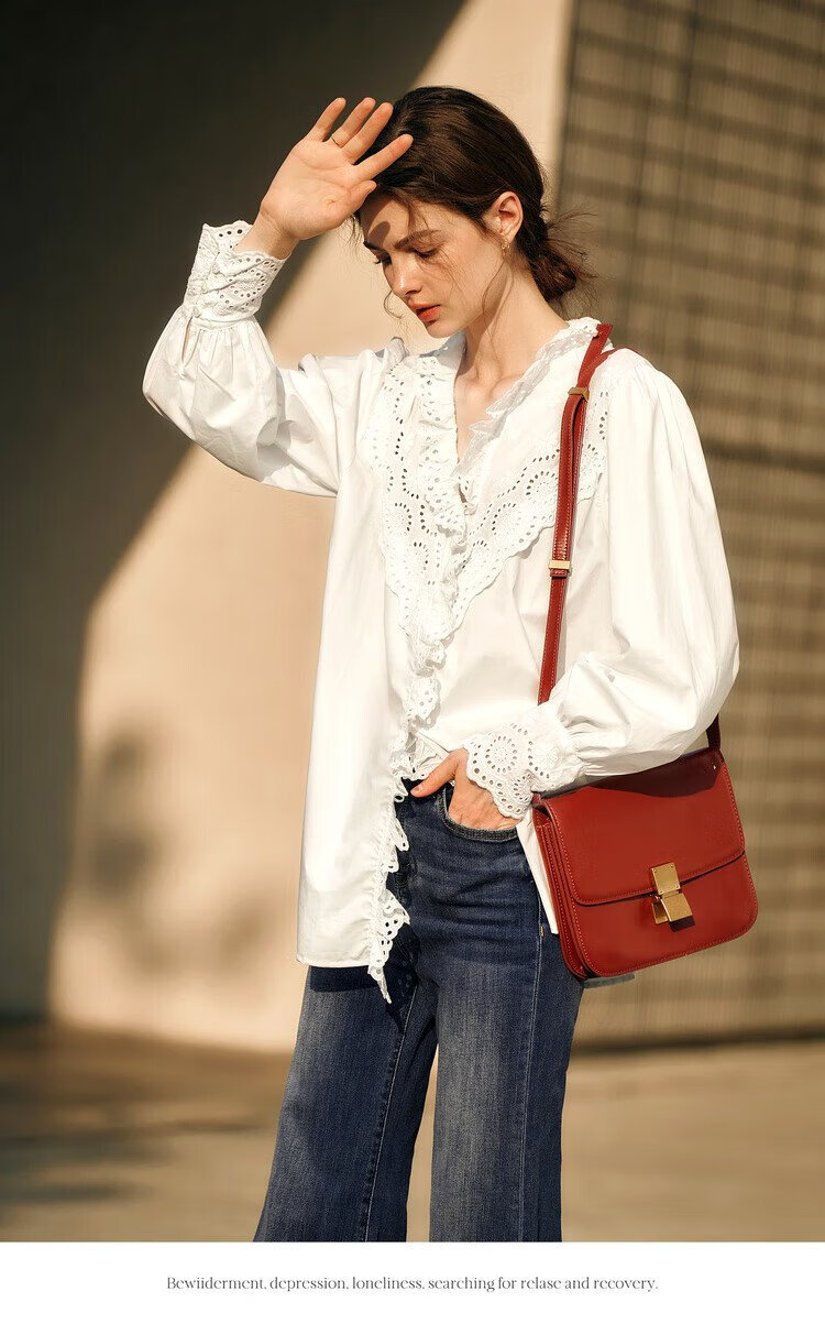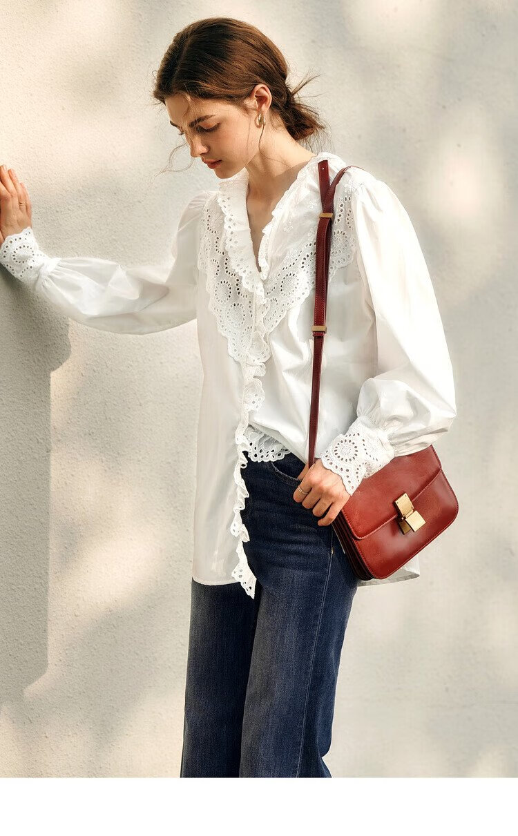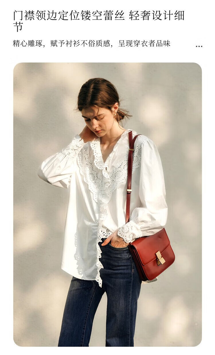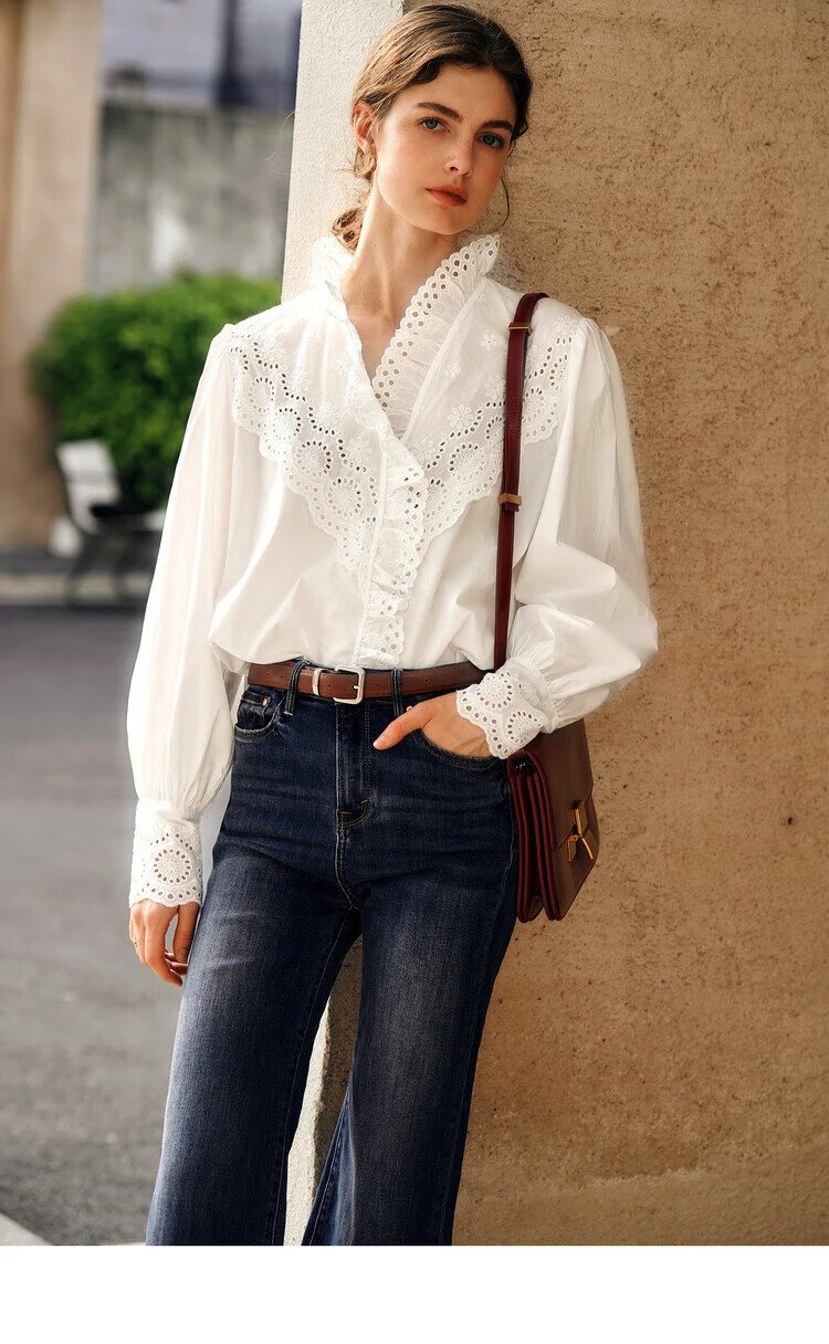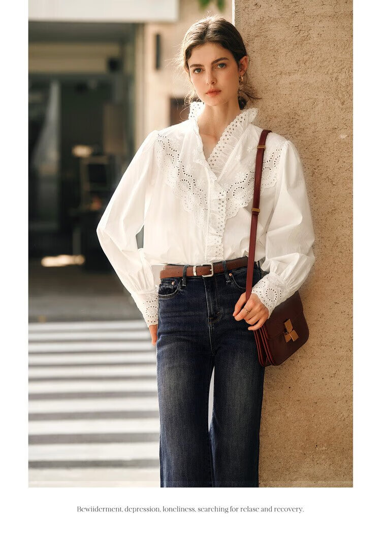 Olrain French white shirt spring and autumn women's lotus leaf collar embroidered hollow shirt temperament commuting white S