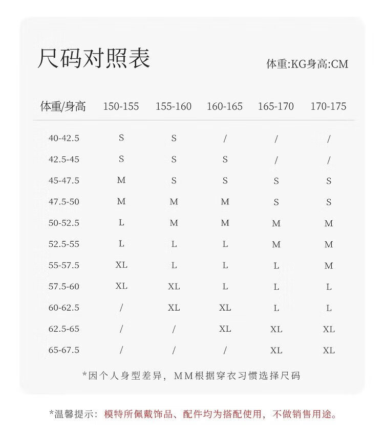 China (cm) 160-165/84-86 165-170 / 88-90 167-172 / 92-96 168-173 / 98-102 170-176 / 106-110