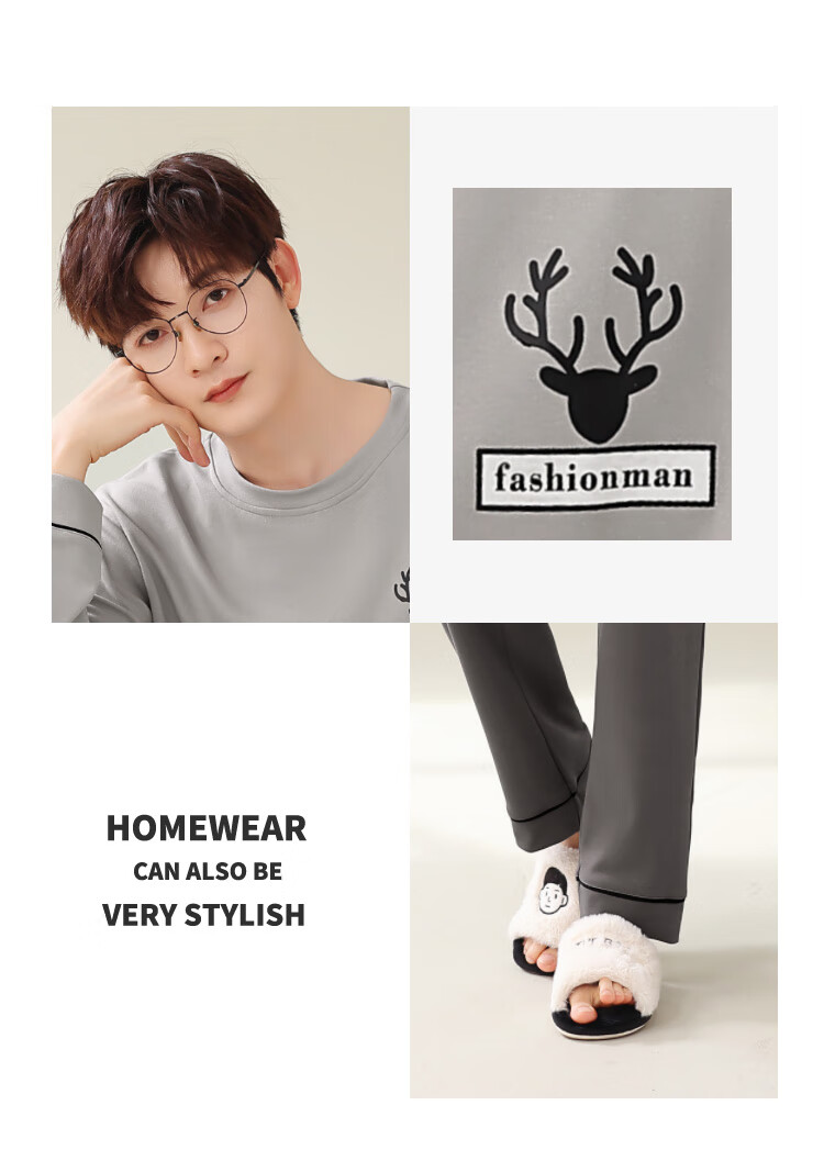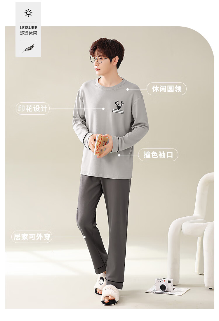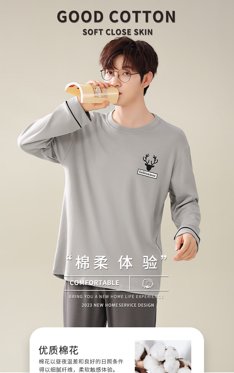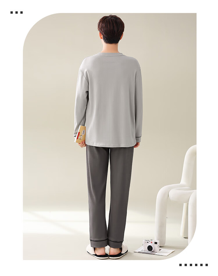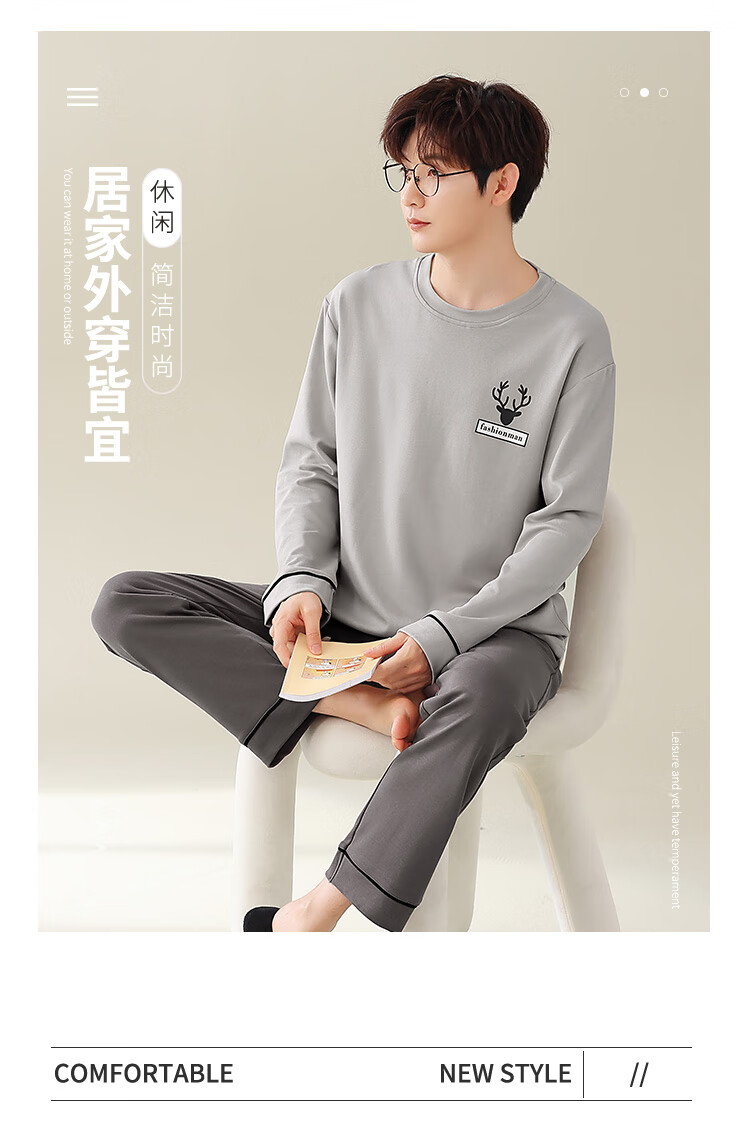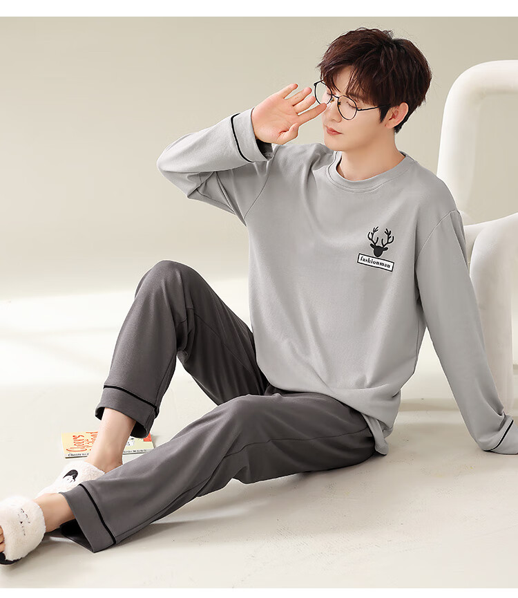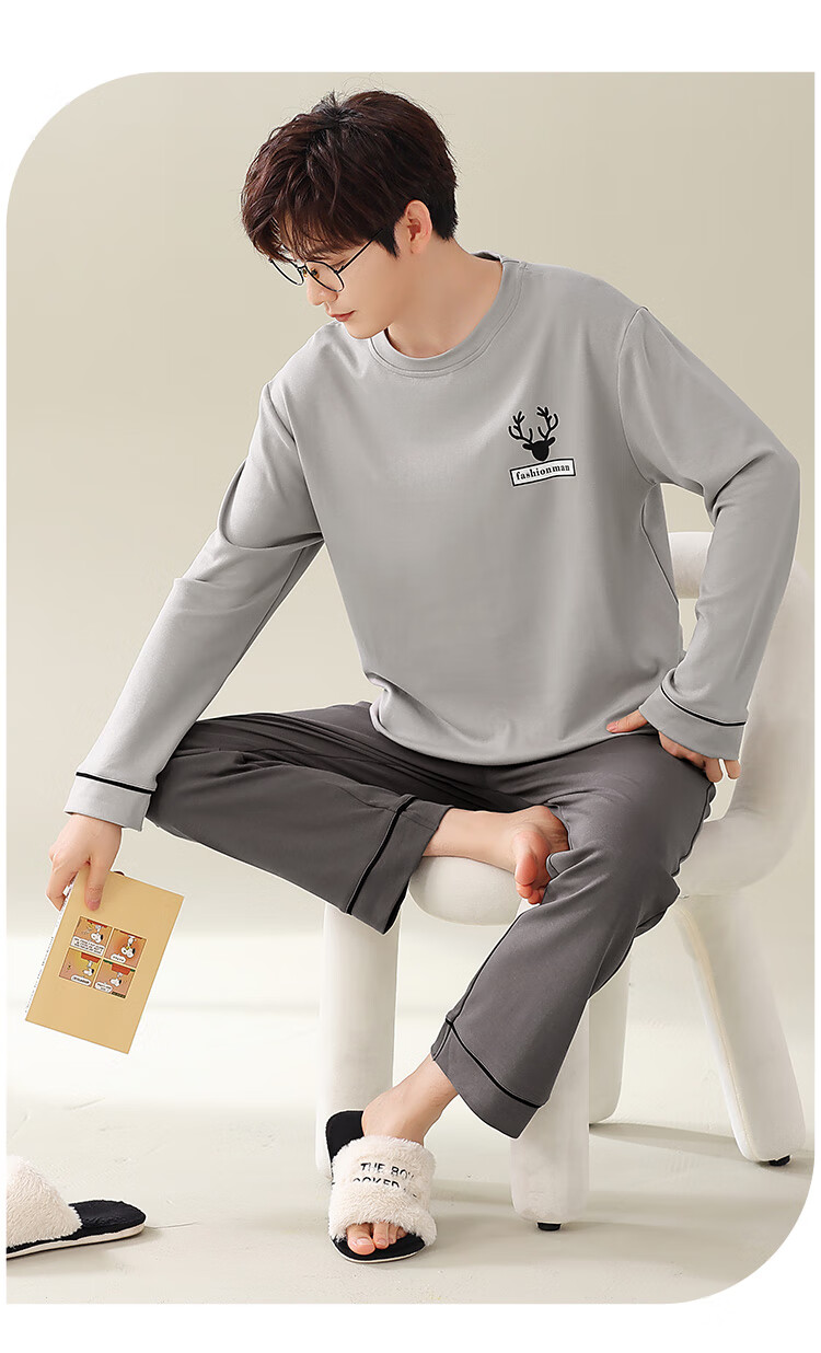Easy and refreshing, anti-mite and anti-bacterial, men's pajamas, men's autumn and winter long-sleeved round neck, can be worn outside, teenagers' home wear set