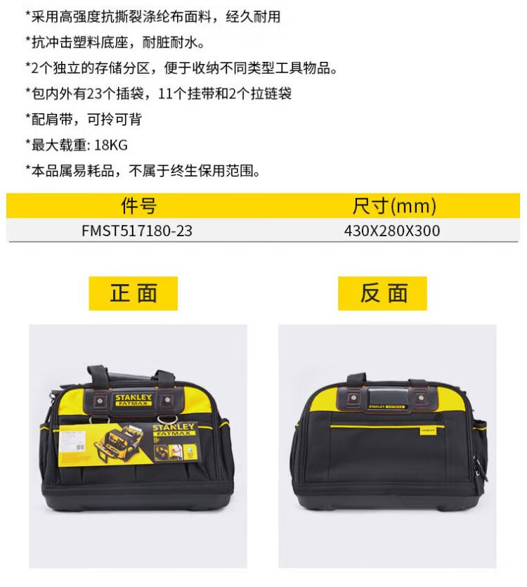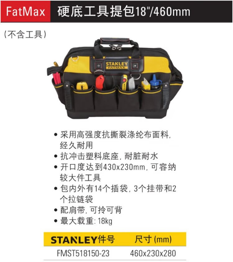 Stanley (STANLEY) hard bottom double-open tool bag handbag crossbody bag electrician bag double-open handbag 17 inches FMST517180-23