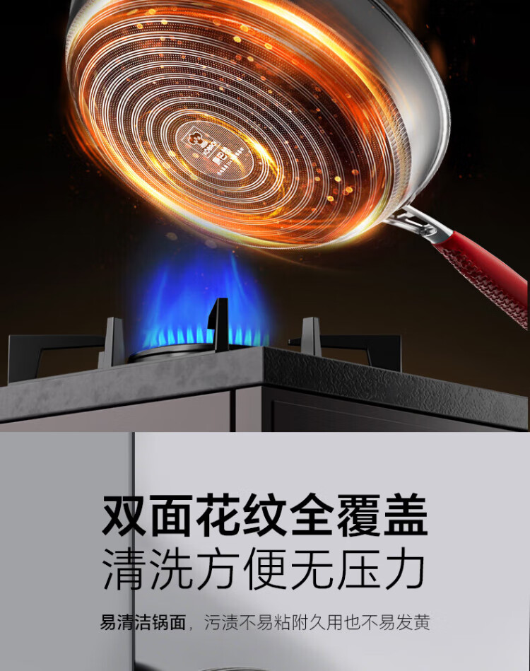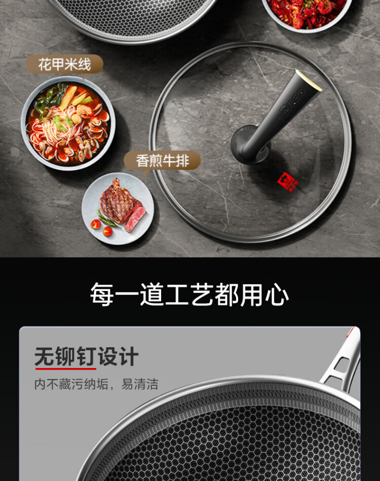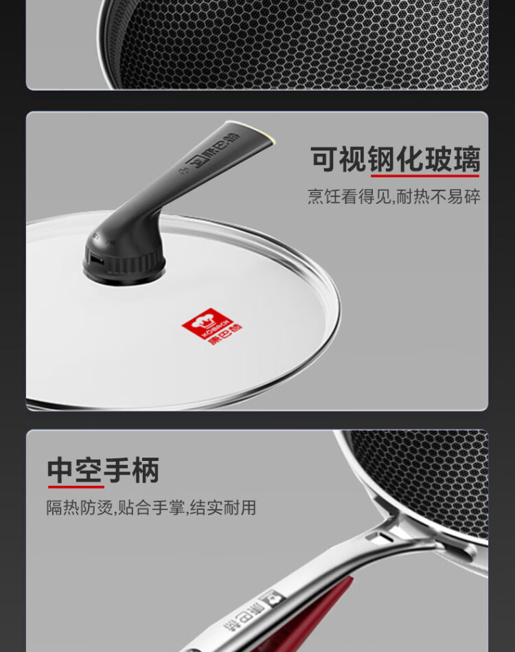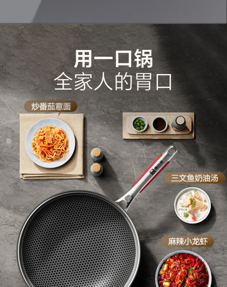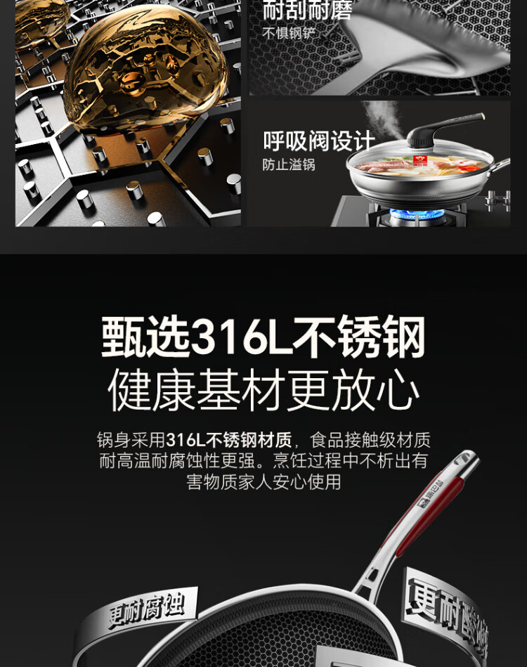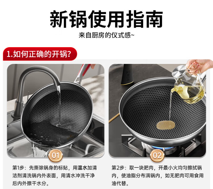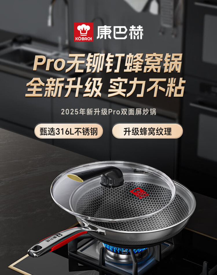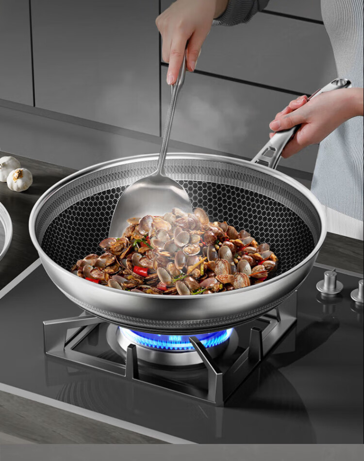 Konbach's new non-stick wok 316L stainless steel wok 32cm double-sided honeycomb flat bottom induction cooker universal