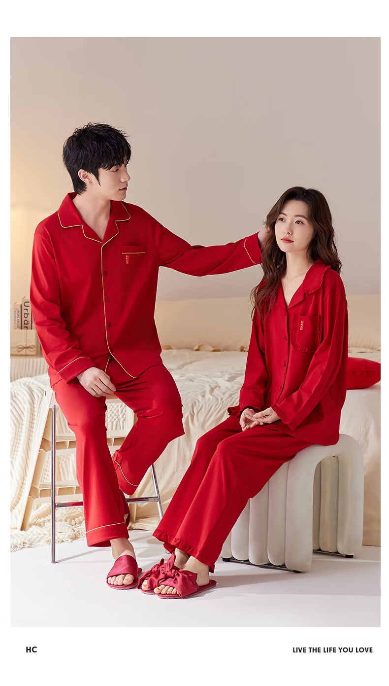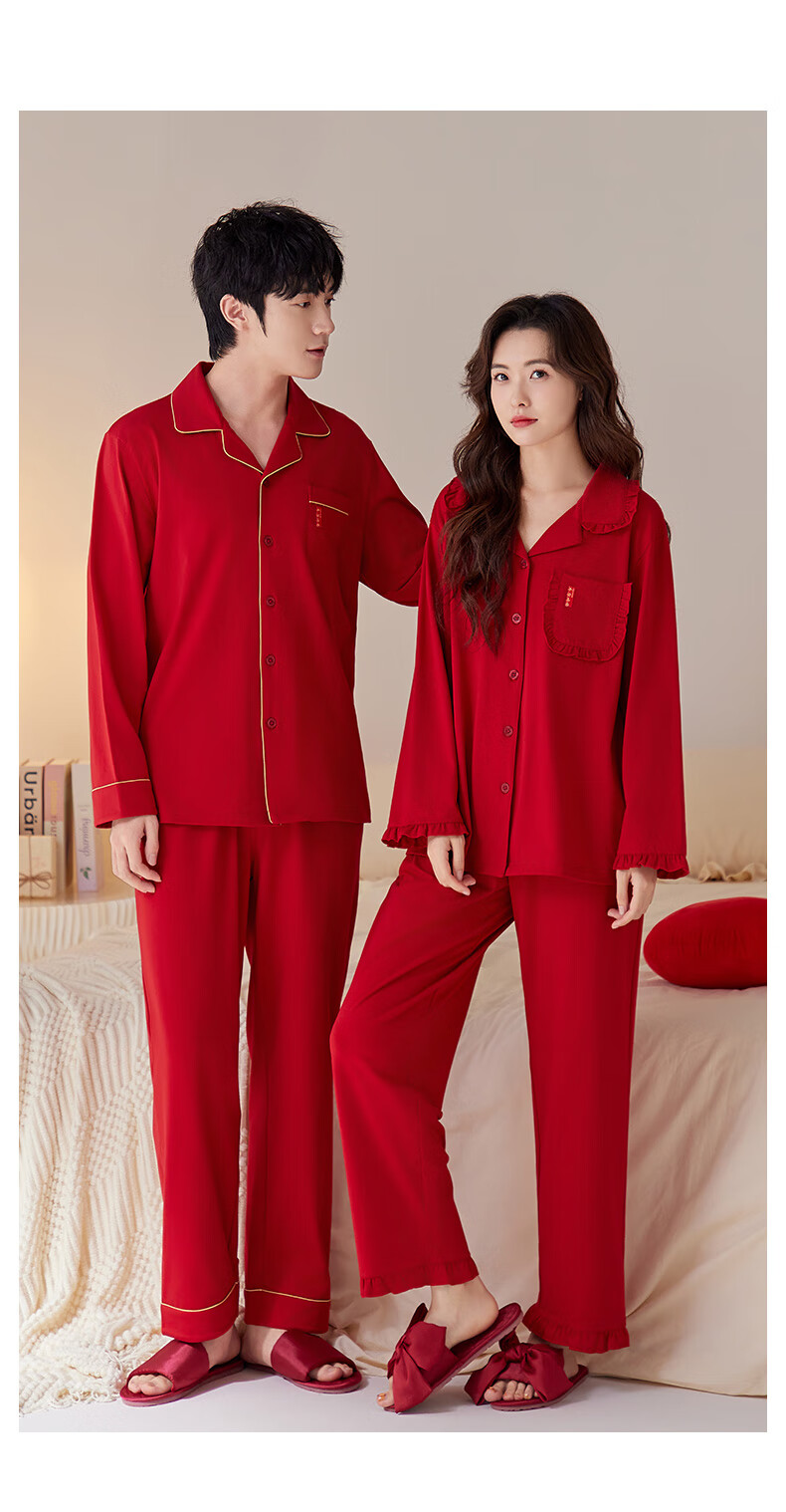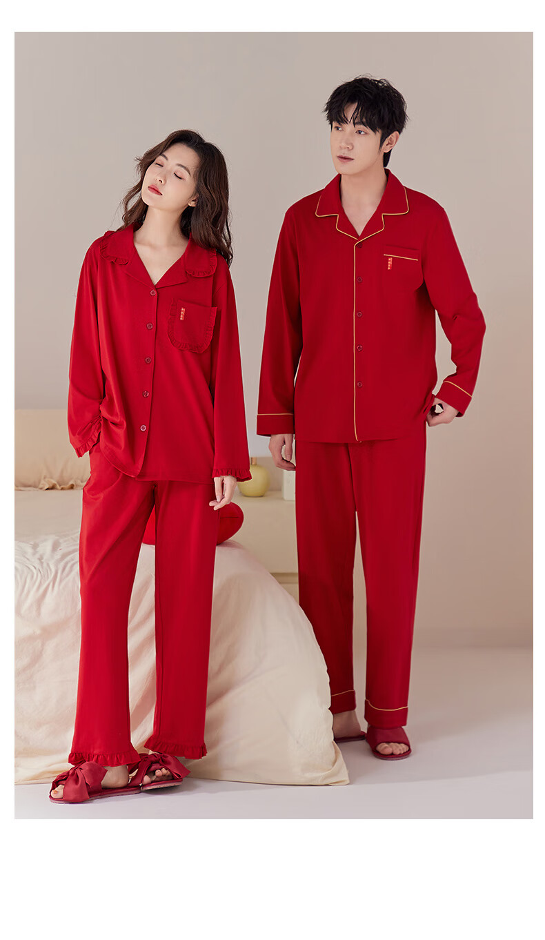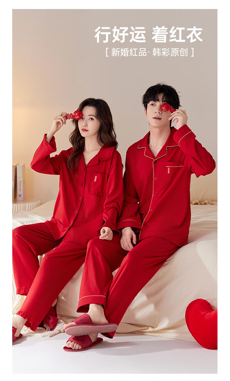 Han Cai Pajamas Women's High-End Pure Cotton Year of the Horse Zodiac Year Women's Wedding New Year Red Couple Pajamas Set Rose Red XXL