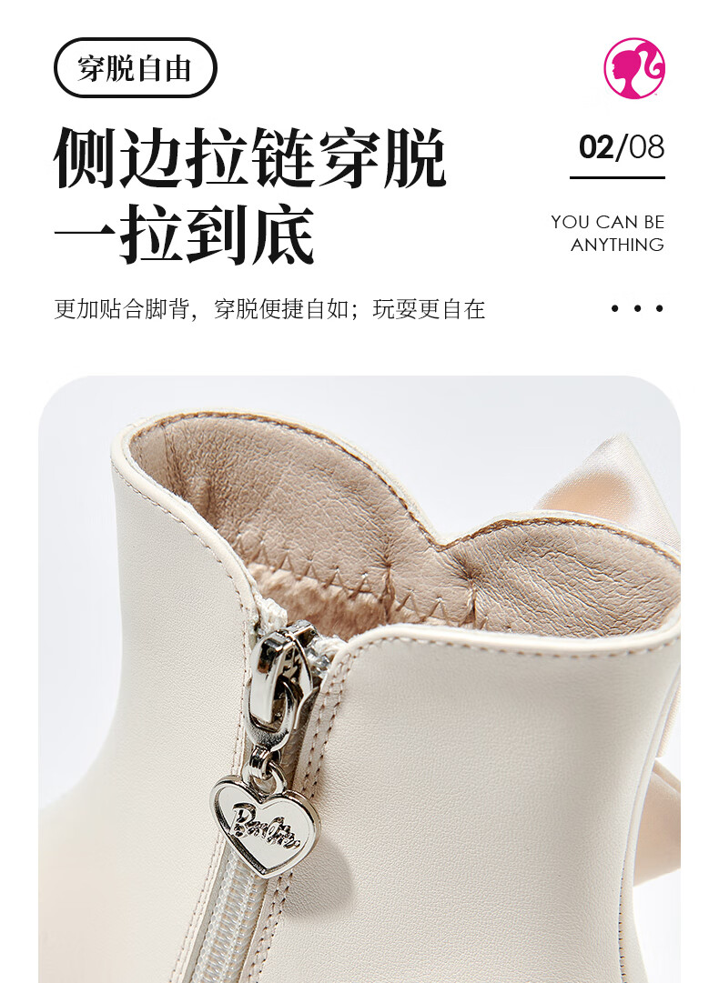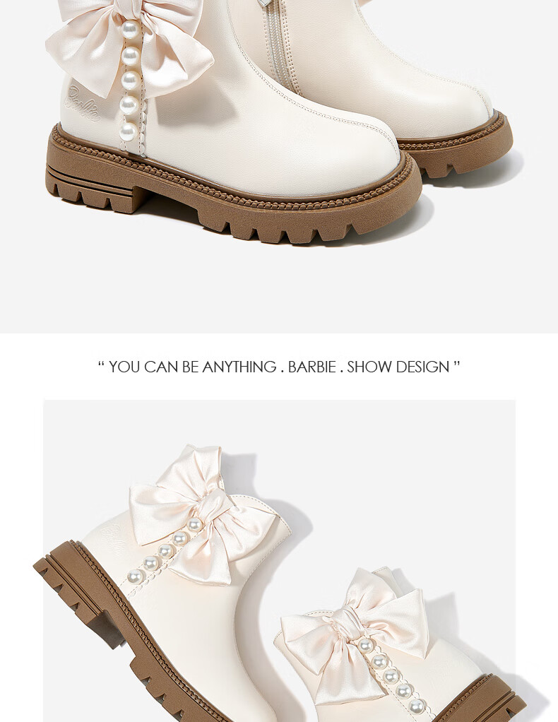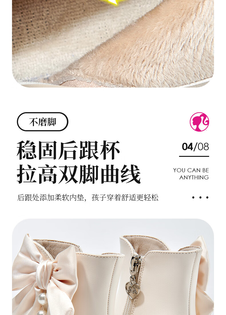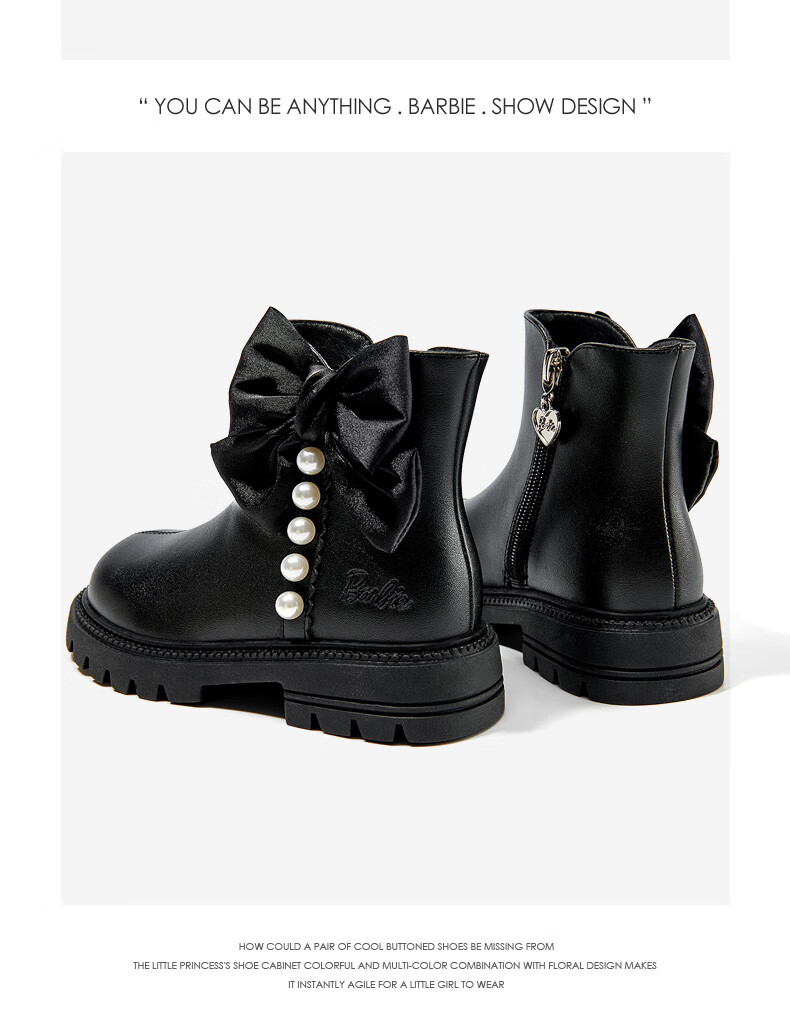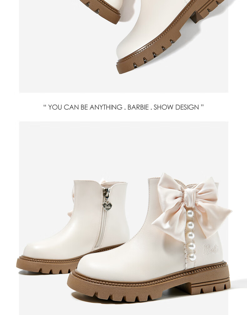 Barbie Girls' Boots Autumn and Winter Plus Velvet Leather Boots Children's Short Boots Girls Crystal Shoes Short Martin Boots DA6678 White 35