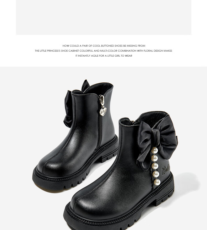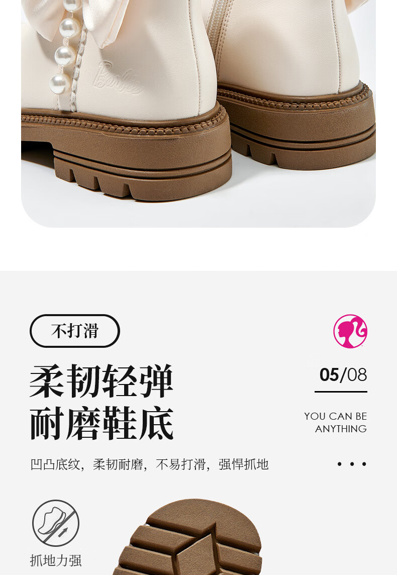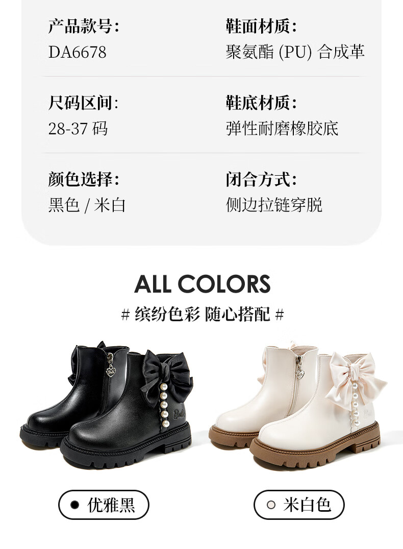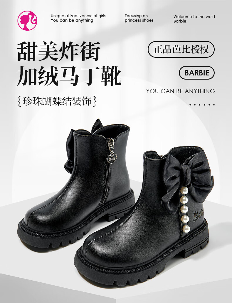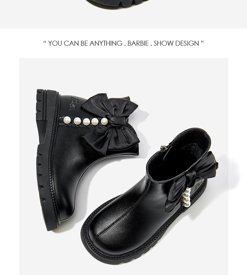 Barbie Girls' Boots Autumn and Winter Plus Velvet Leather Boots Children's Short Boots Girls Crystal Shoes Short Martin Boots DA6678 White 35