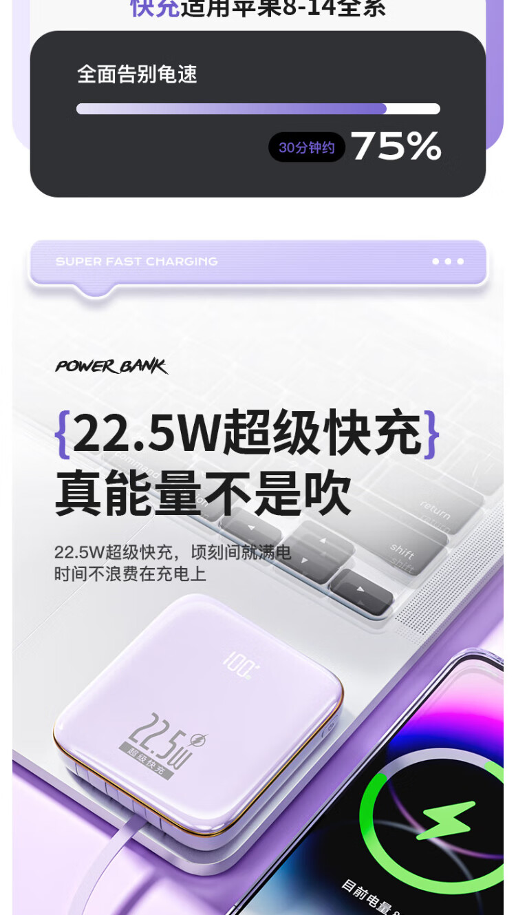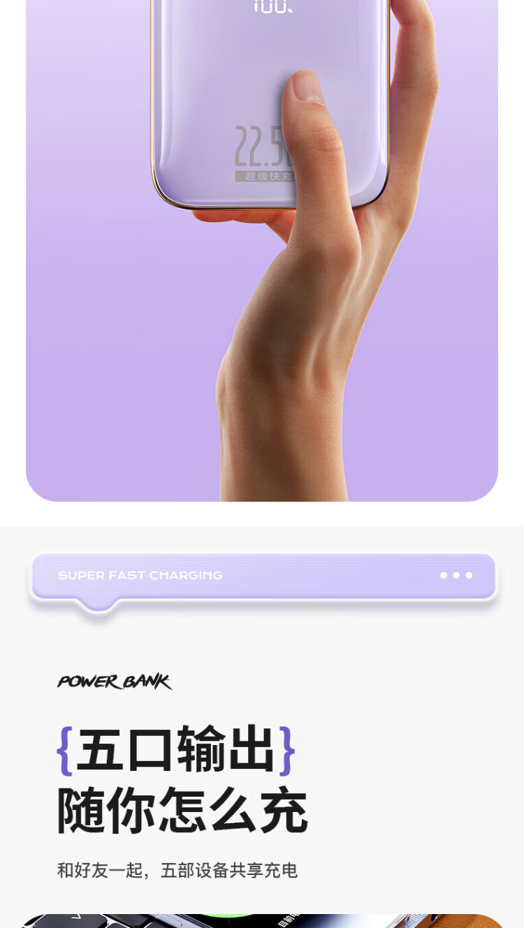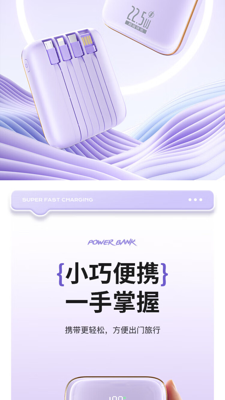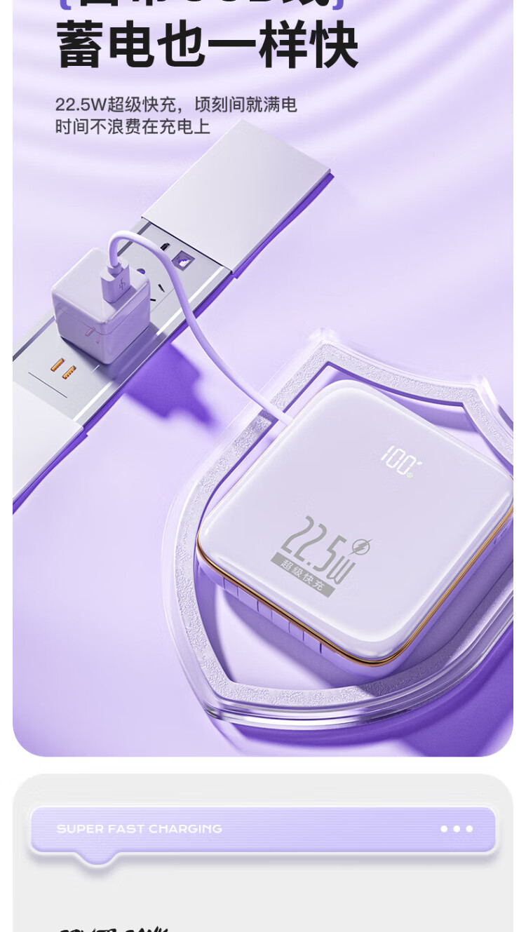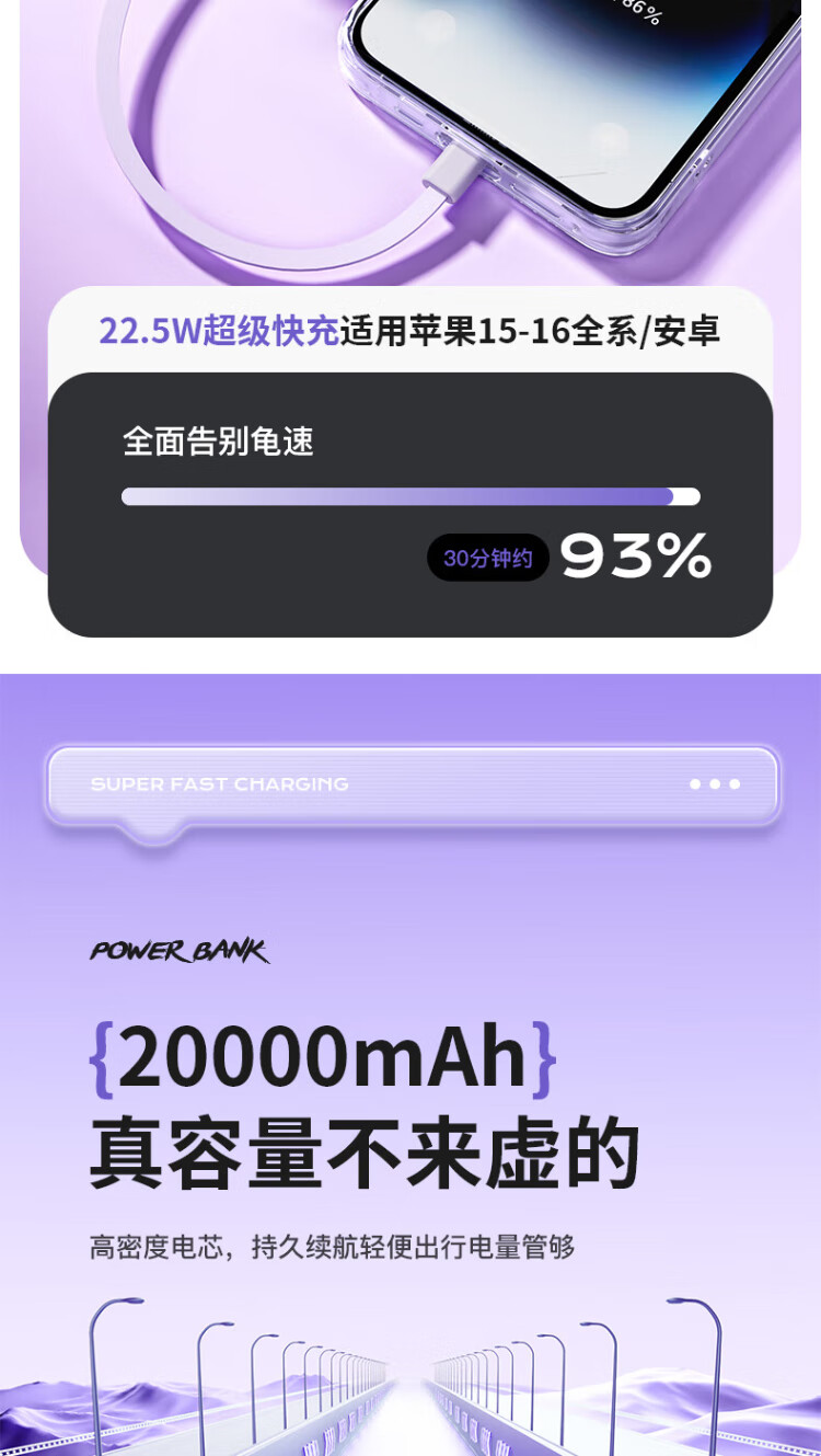 Zalo 3C certification丨22.5W super fast charging power bank 20000 mAh, comes with cable, large capacity, can be used on airplanes, suitable for Huawei and Apple PD18/20W mobile power supply