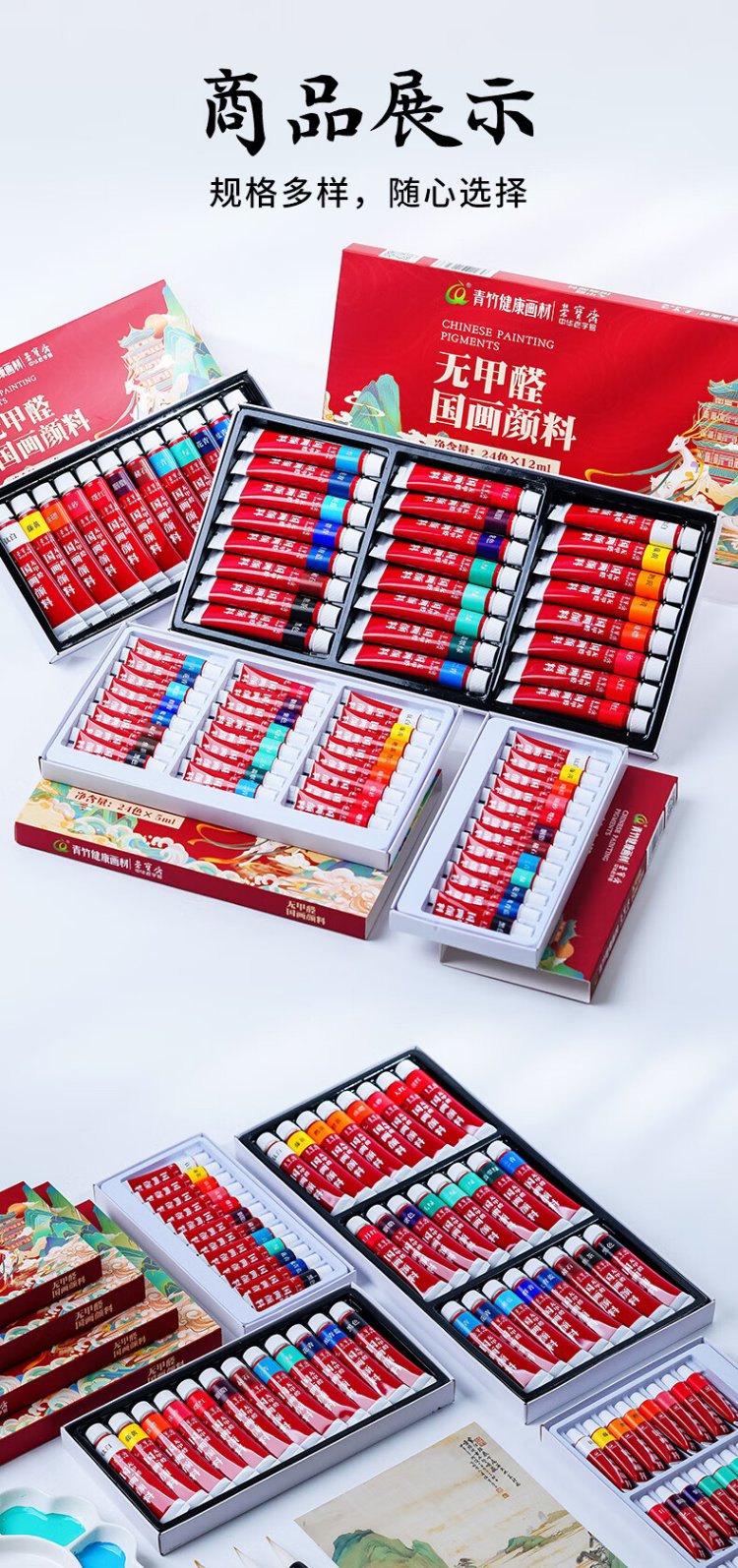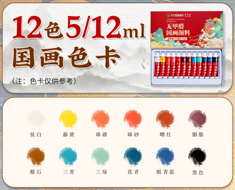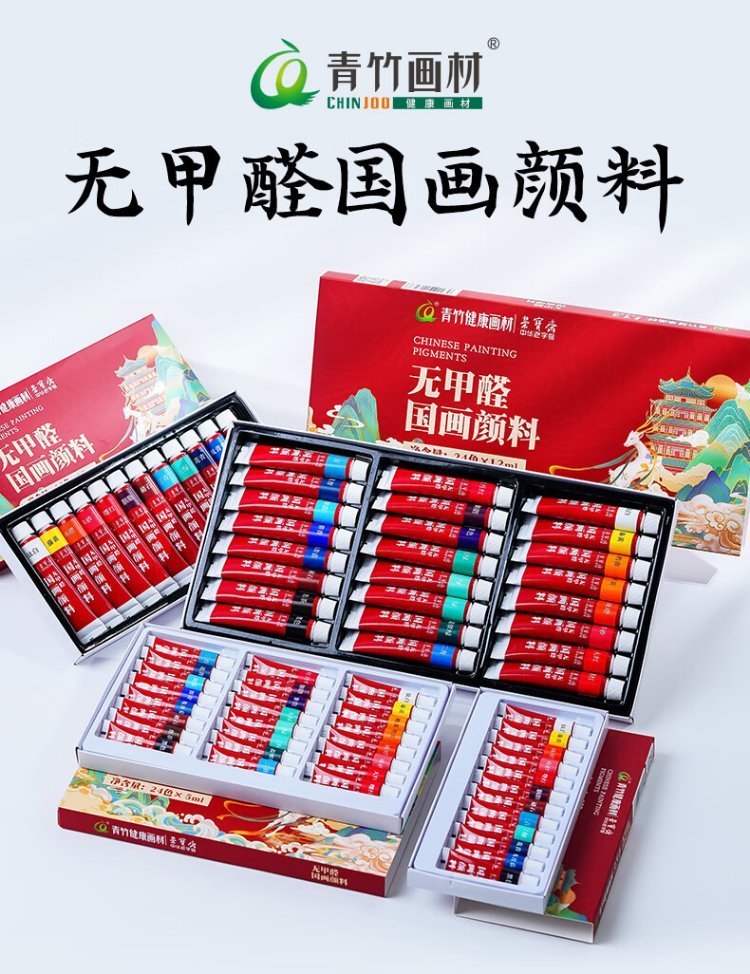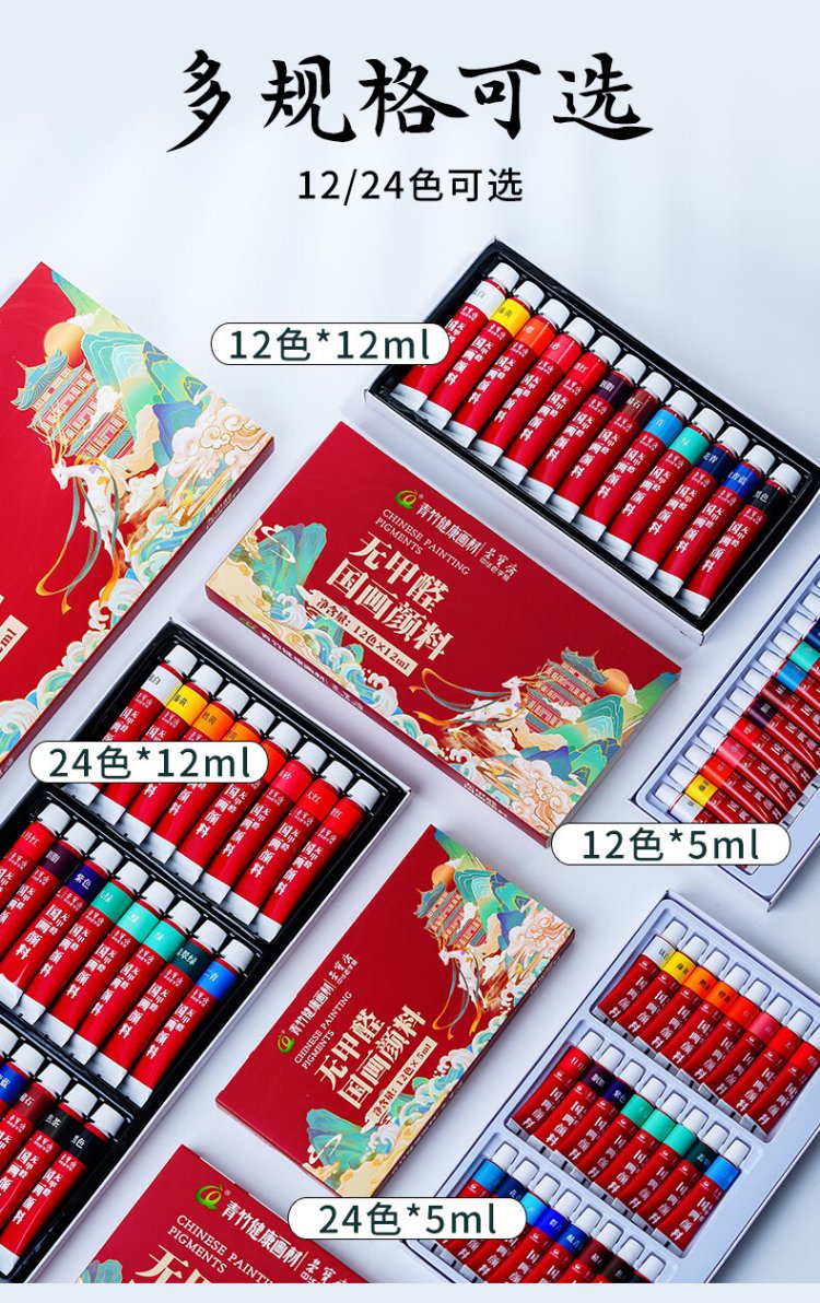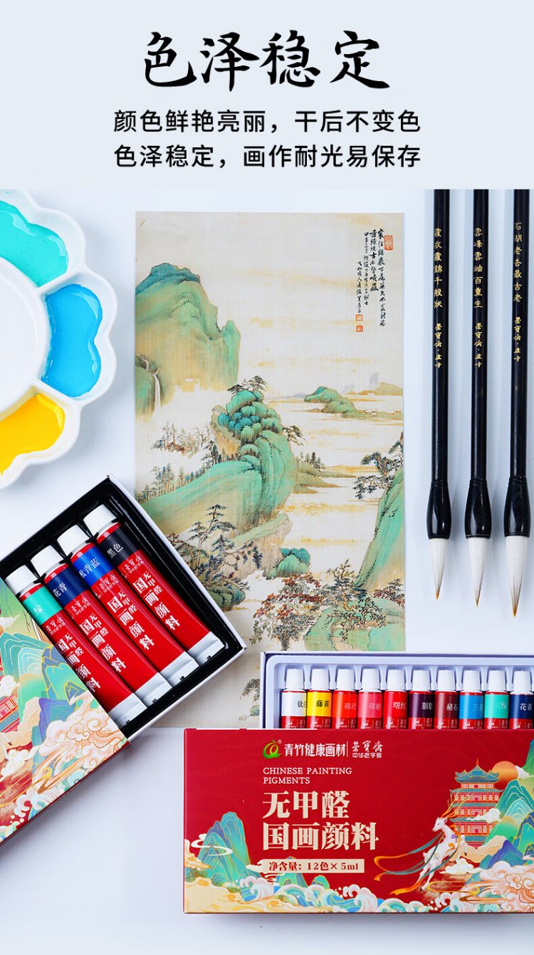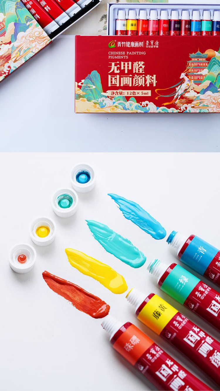 Qingzhu painting materials (CHINJOO) Chinese painting pigment set ink painting formaldehyde-free safe material for adult beginners professional art painting Qingzhu & Rongbaozhai joint model (12ml*12 colors)