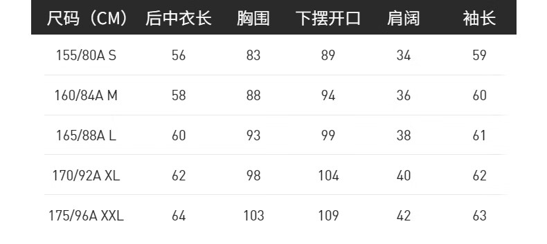 China (cm) 160-165/84-86 165-170 / 88-90 167-172 / 92-96 168-173 / 98-102 170-176 / 106-110
