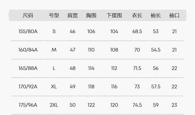 China (cm) 160-165/84-86 165-170 / 88-90 167-172 / 92-96 168-173 / 98-102 170-176 / 106-110