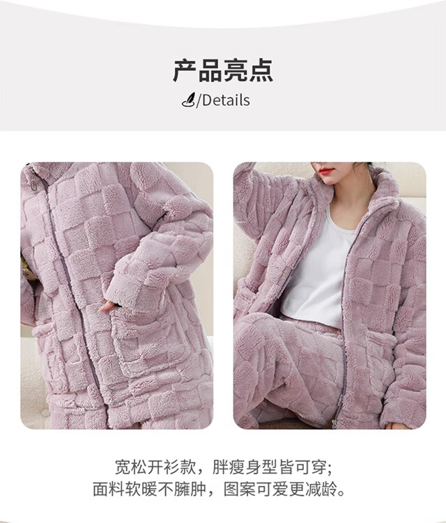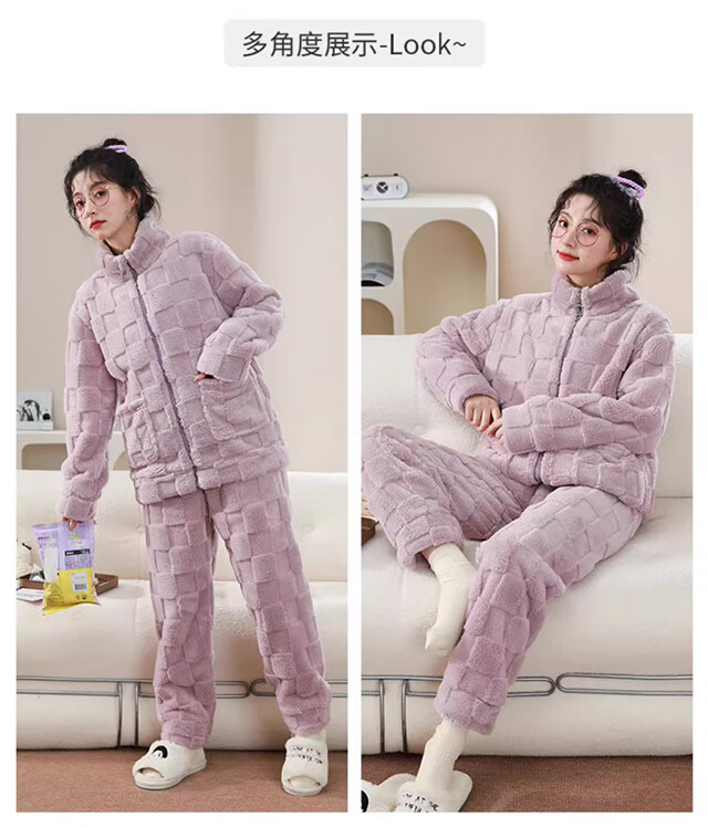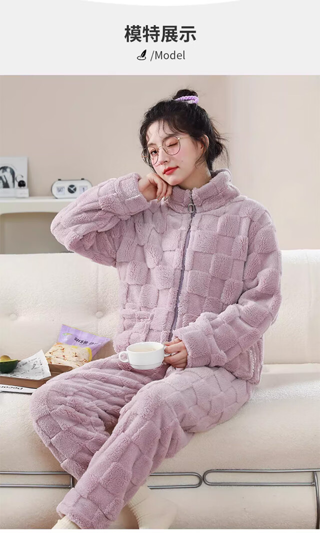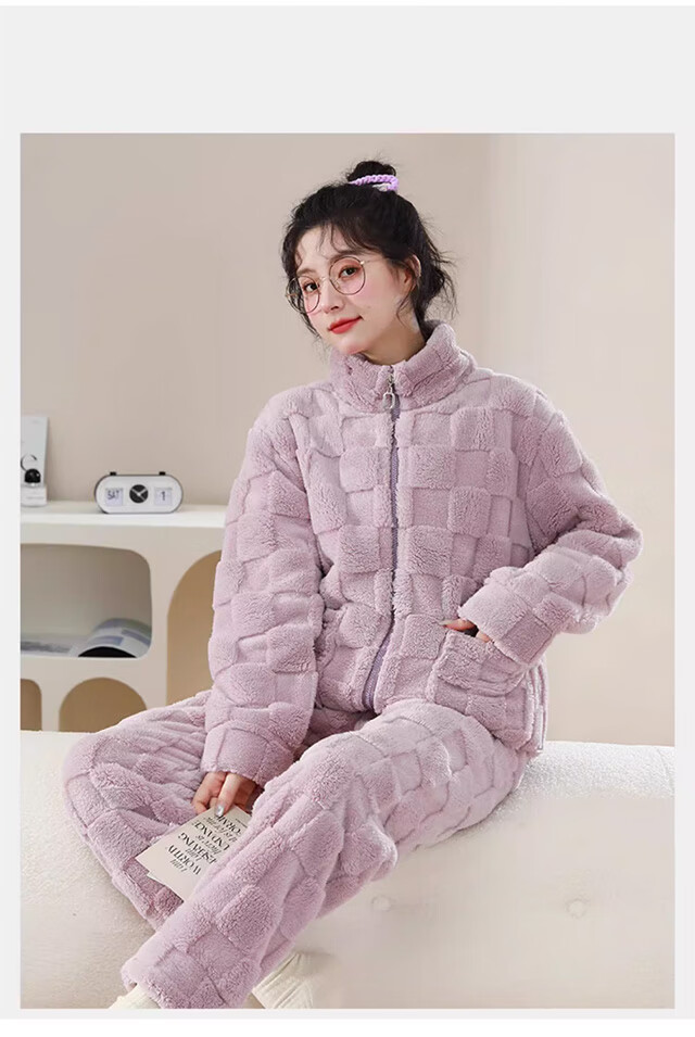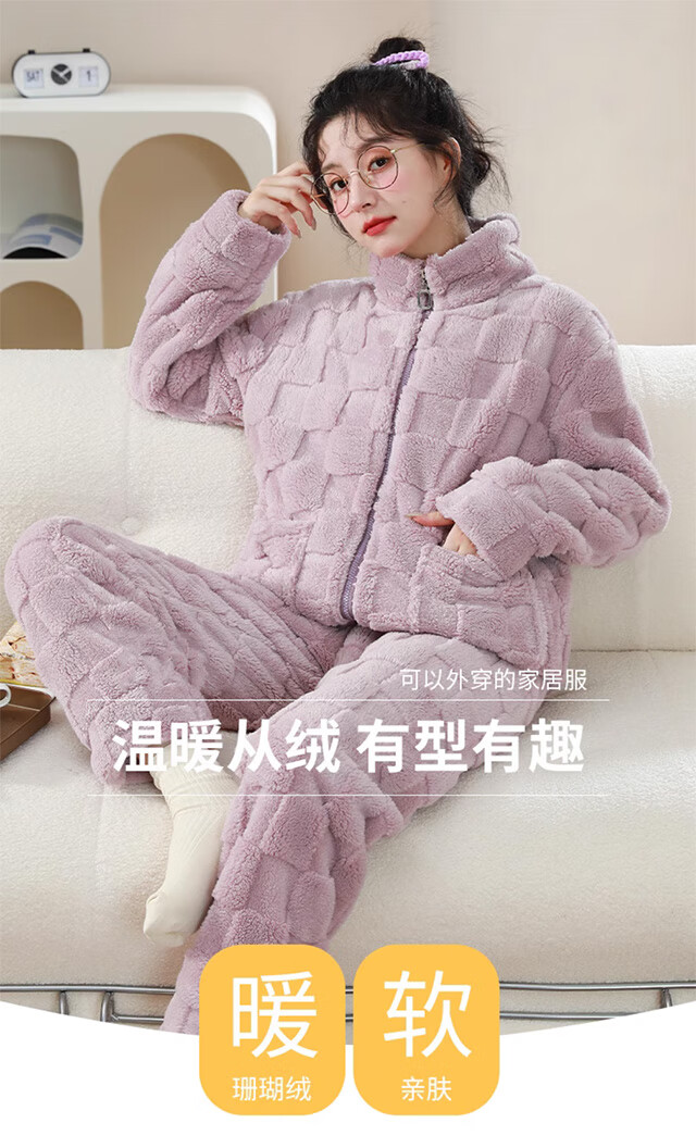 Langsha pajamas women's autumn and winter thickened coral velvet home clothes two-piece set that can be worn outside zipper stand collar women's warm velvet suit