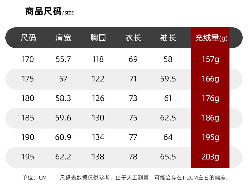 China (cm) 165 / 88-90 170 / 96-98 175 / 108-110 180 / 118-122 185 / 126-130
