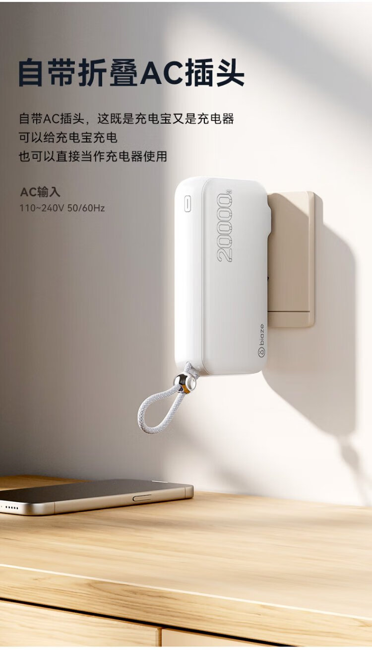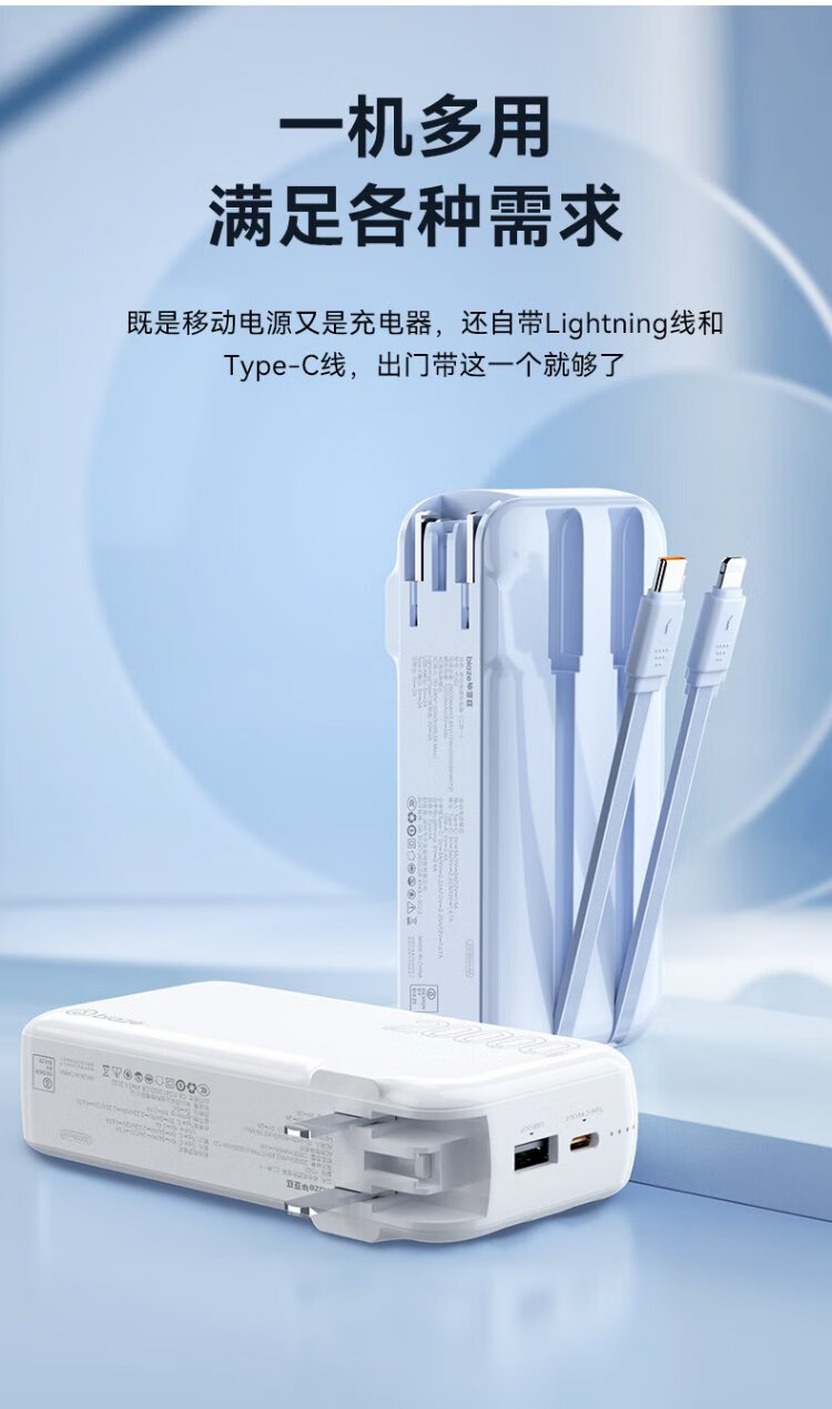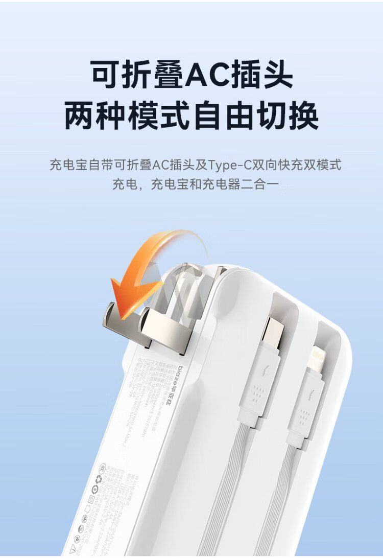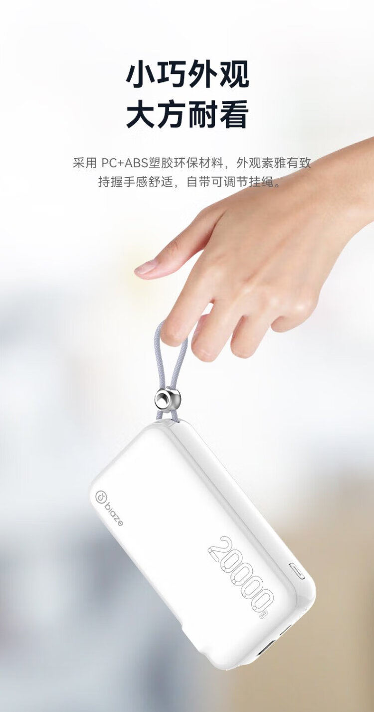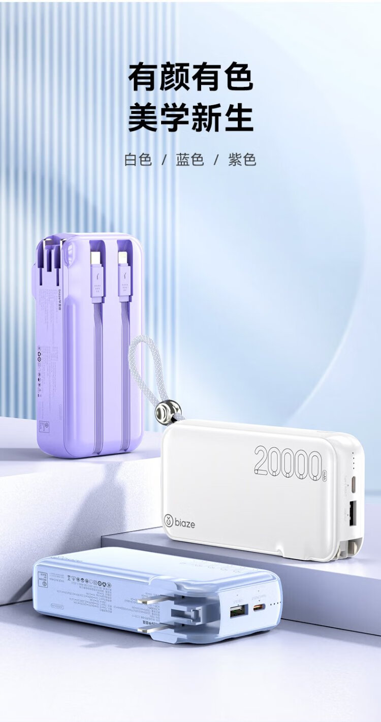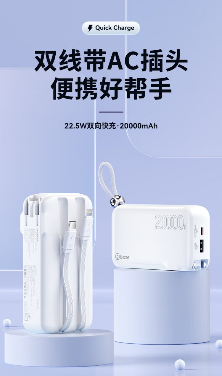Biaz 3C certified power bank 20000 mAh wall plug with line 22.5W fast charging charger three-in-one portable power bank suitable for Apple 17 Huawei Xiaomi and other YD50 white