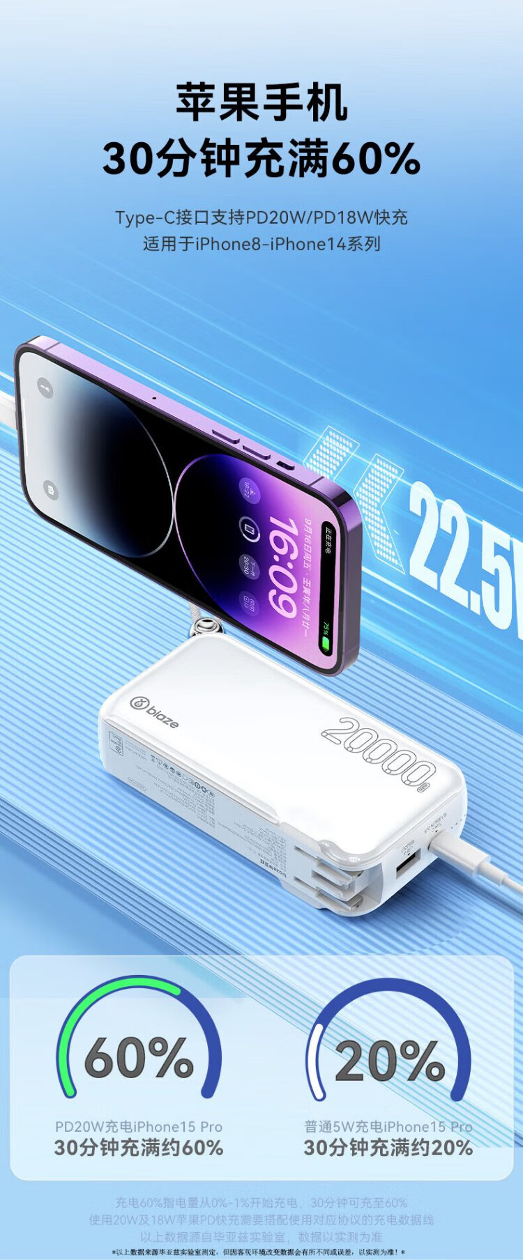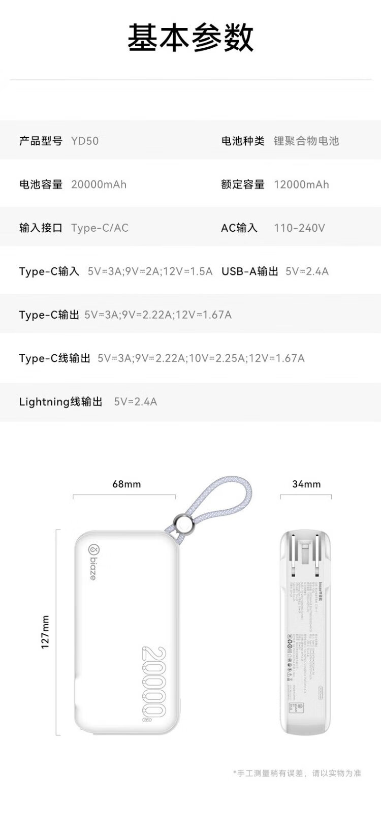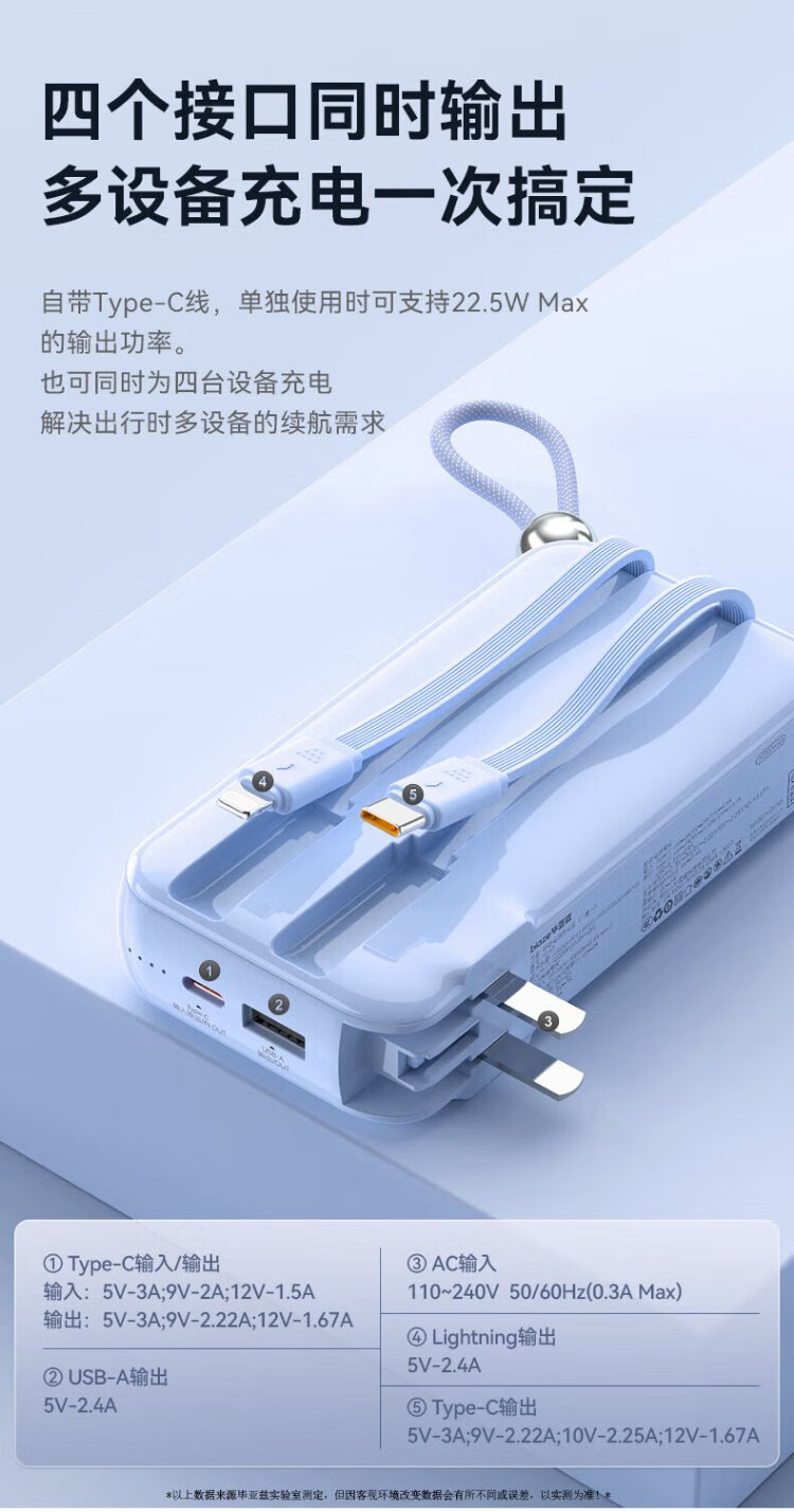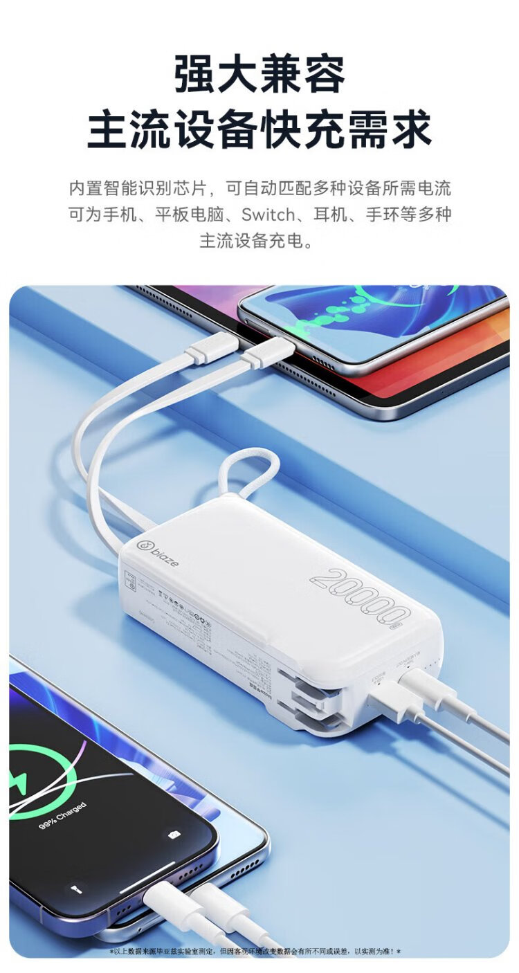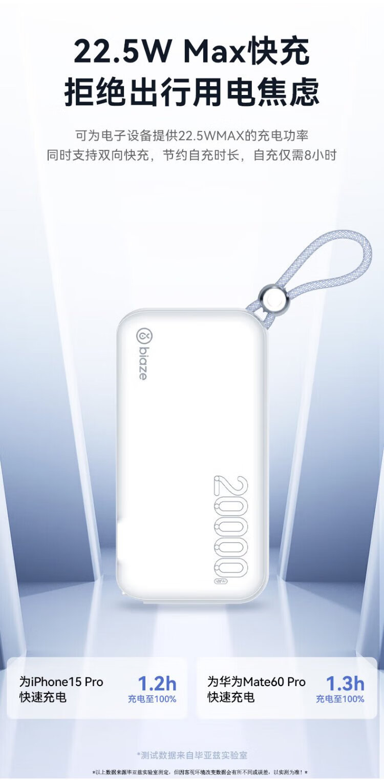 Biaz 3C certified power bank 20000 mAh wall plug with line 22.5W fast charging charger three-in-one portable power bank suitable for Apple 17 Huawei Xiaomi and other YD50 white