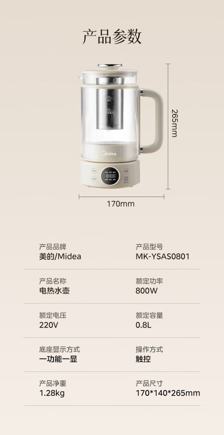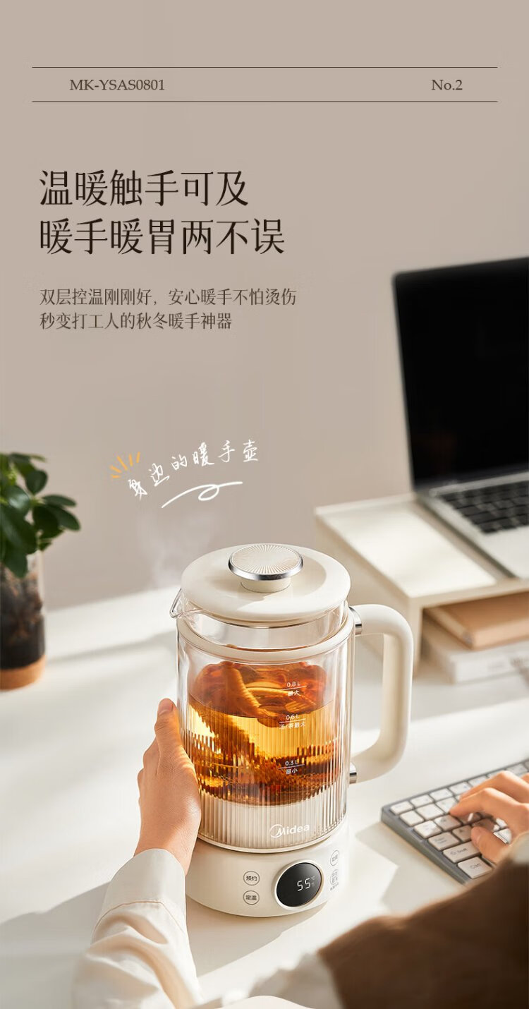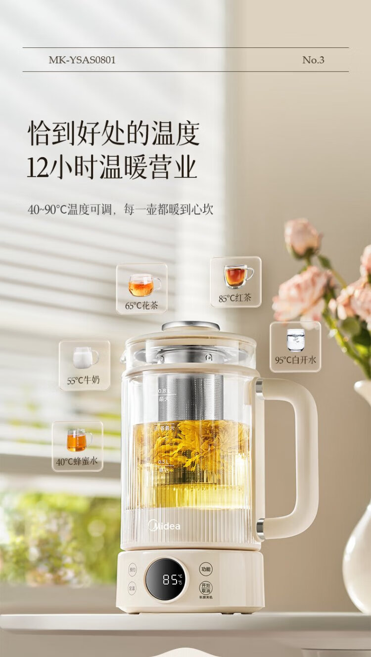 Midea health kettle, double-layered anti-scald tea kettle, 24h reservation kettle, 12-hour constant temperature electric kettle, antibacterial 316L, national subsidy YSAS0801