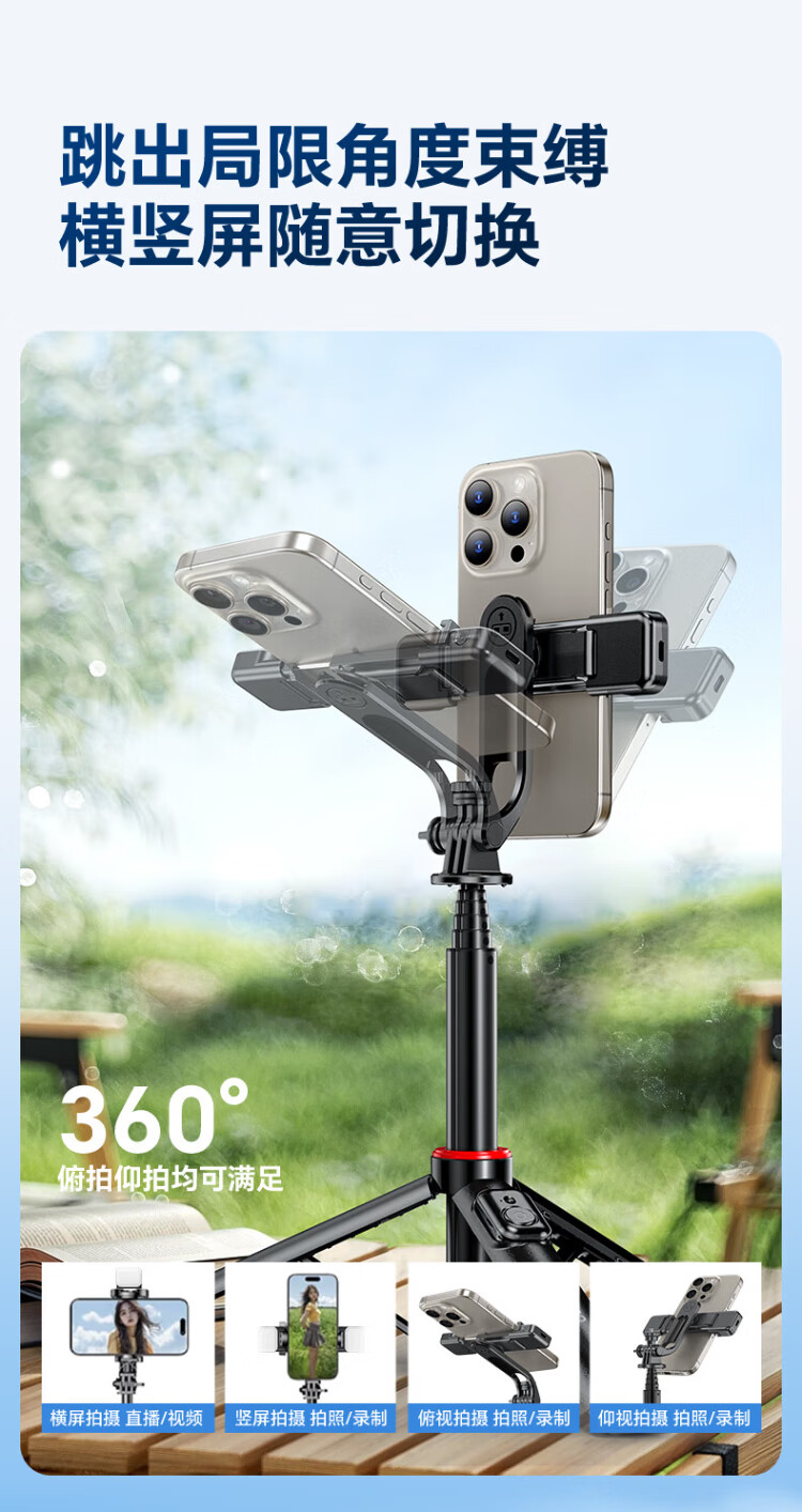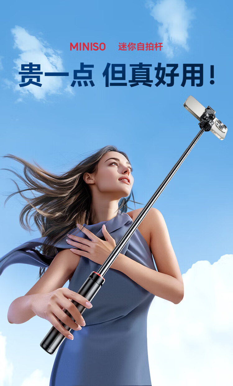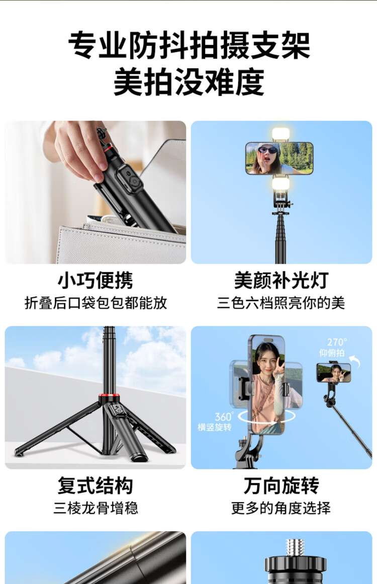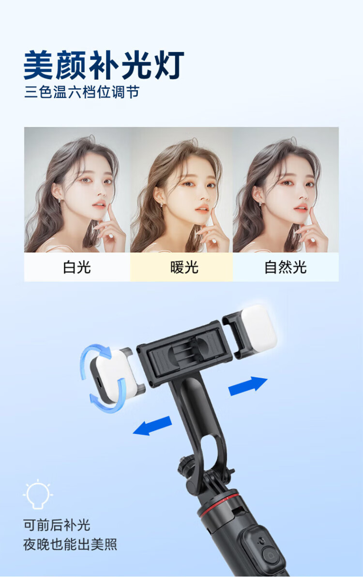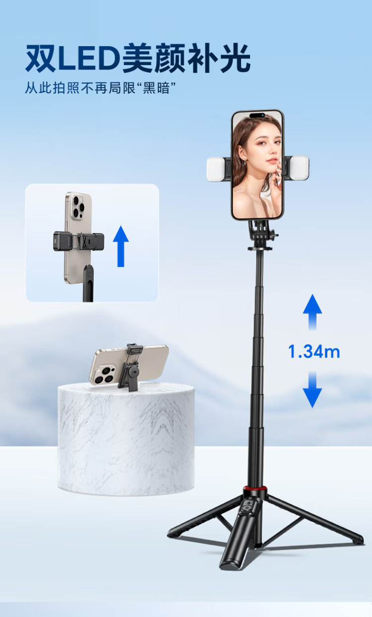 MINISO with beauty lamp, selfie stick with lamp, handheld mobile phone telescopic tripod, travel selfie artifact, 360-degree rotating fully automatic multi-functional portable floor stand