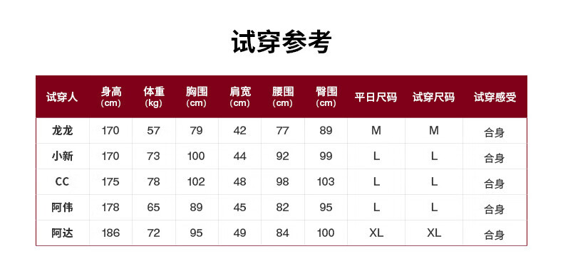 China (cm) 165 / 88-90 170 / 96-98 175 / 108-110 180 / 118-122 185 / 126-130