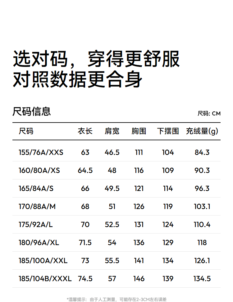 China (cm) 160-165/84-86 165-170 / 88-90 167-172 / 92-96 168-173 / 98-102 170-176 / 106-110