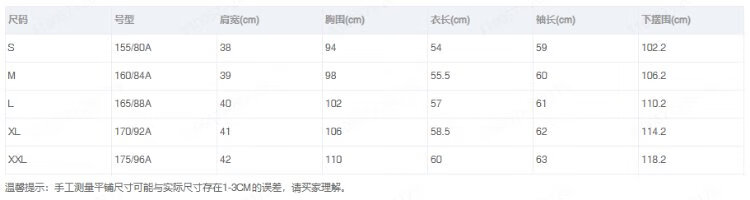 China (cm) 160-165/84-86 165-170 / 88-90 167-172 / 92-96 168-173 / 98-102 170-176 / 106-110