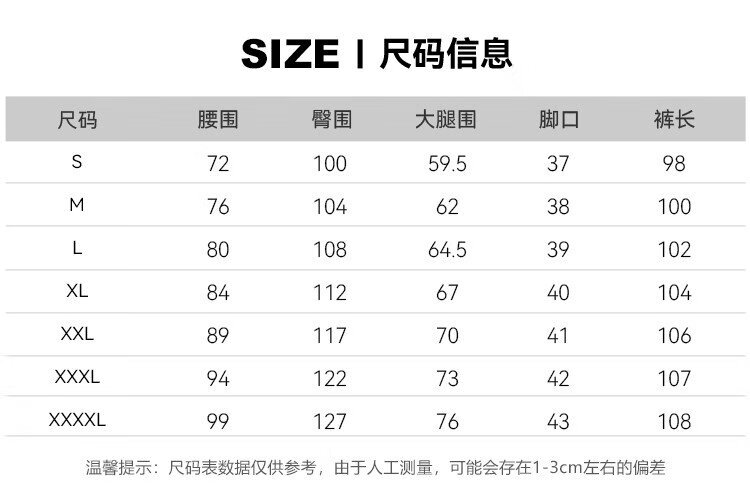 Outseam (cm) 99 cm 101.5 cm 104 cm 106.5 cm 109 cm
