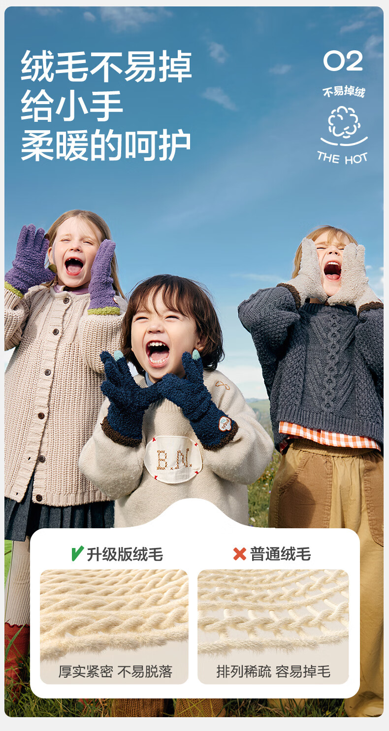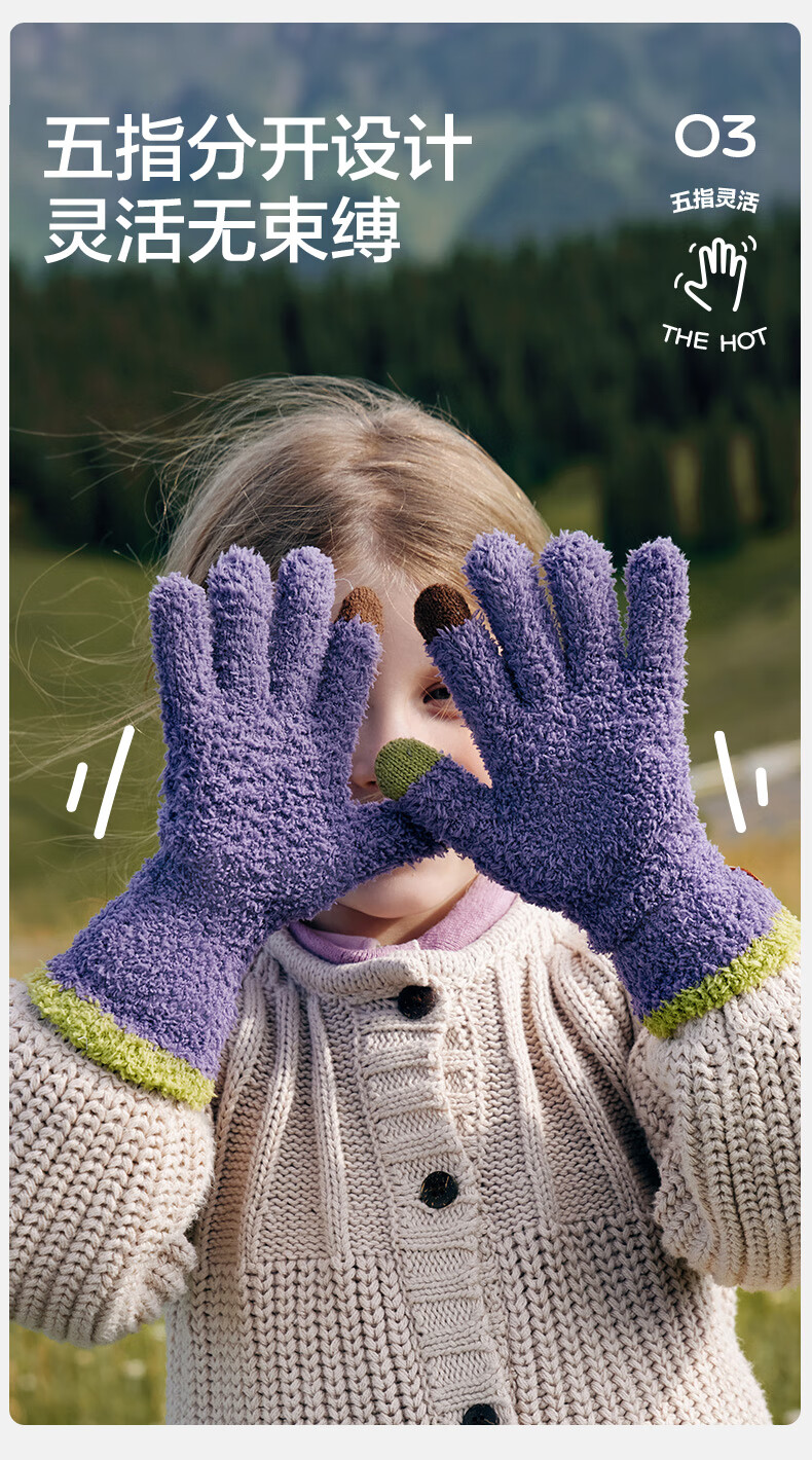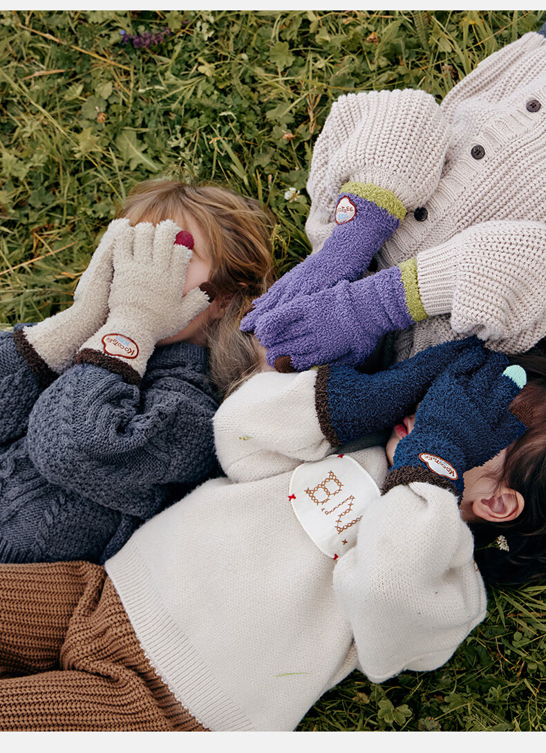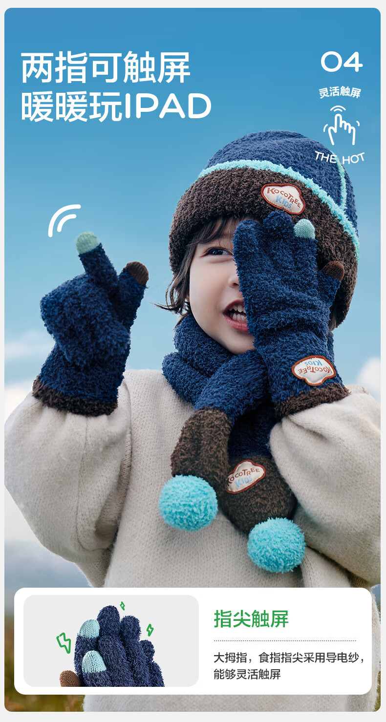 Kocotree New Year's gift kk tree children's gloves warm plus velvet thickened soft waxy color-blocked five-finger gloves touch screen blue
