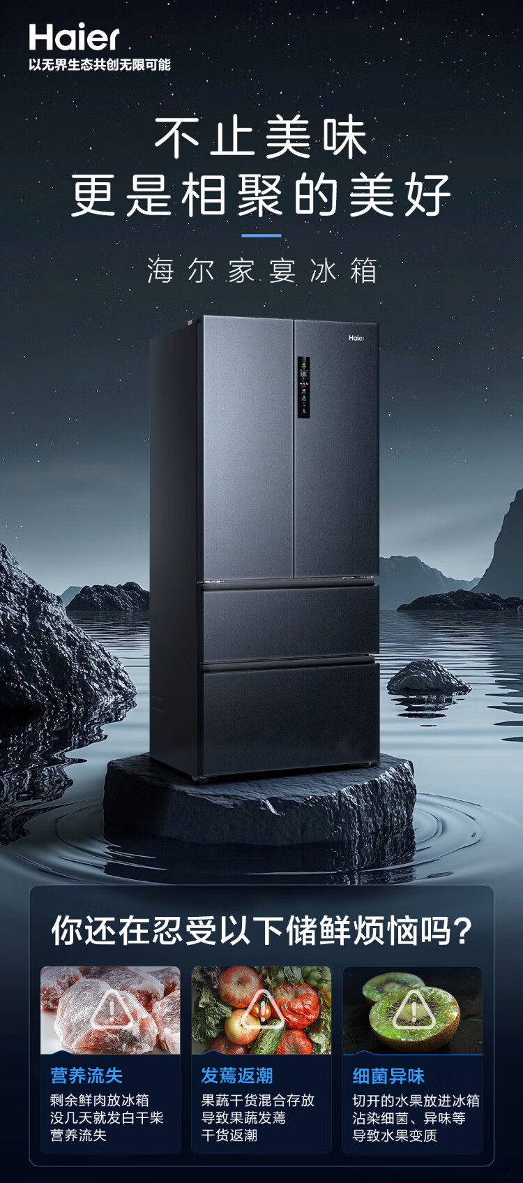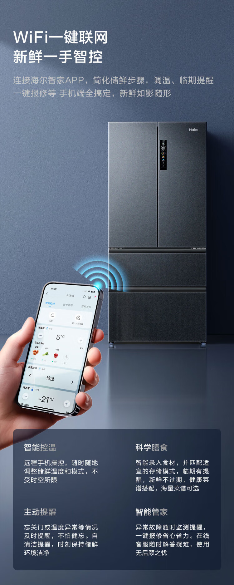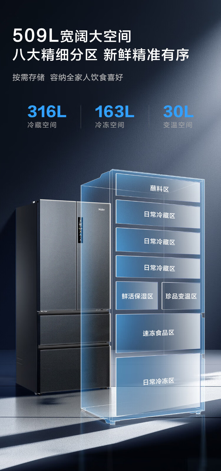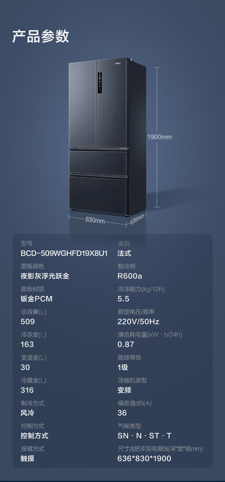 Haier Family Banquet 509-liter full-space fresh-keeping French multi-door four-door refrigerator household air-cooled frost-free first-class energy efficiency frequency conversion BCD-509WGHFD19X8U1 20% national subsidy