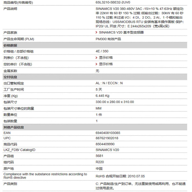 Siemens inverter (SIEMENS) 6SL3210-5BE32-2UV0 v20 22kw spot