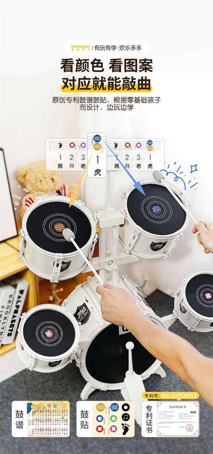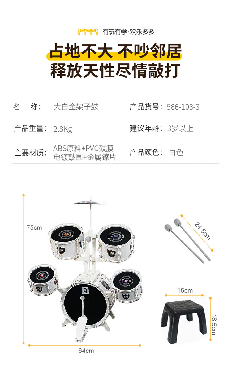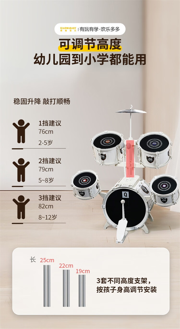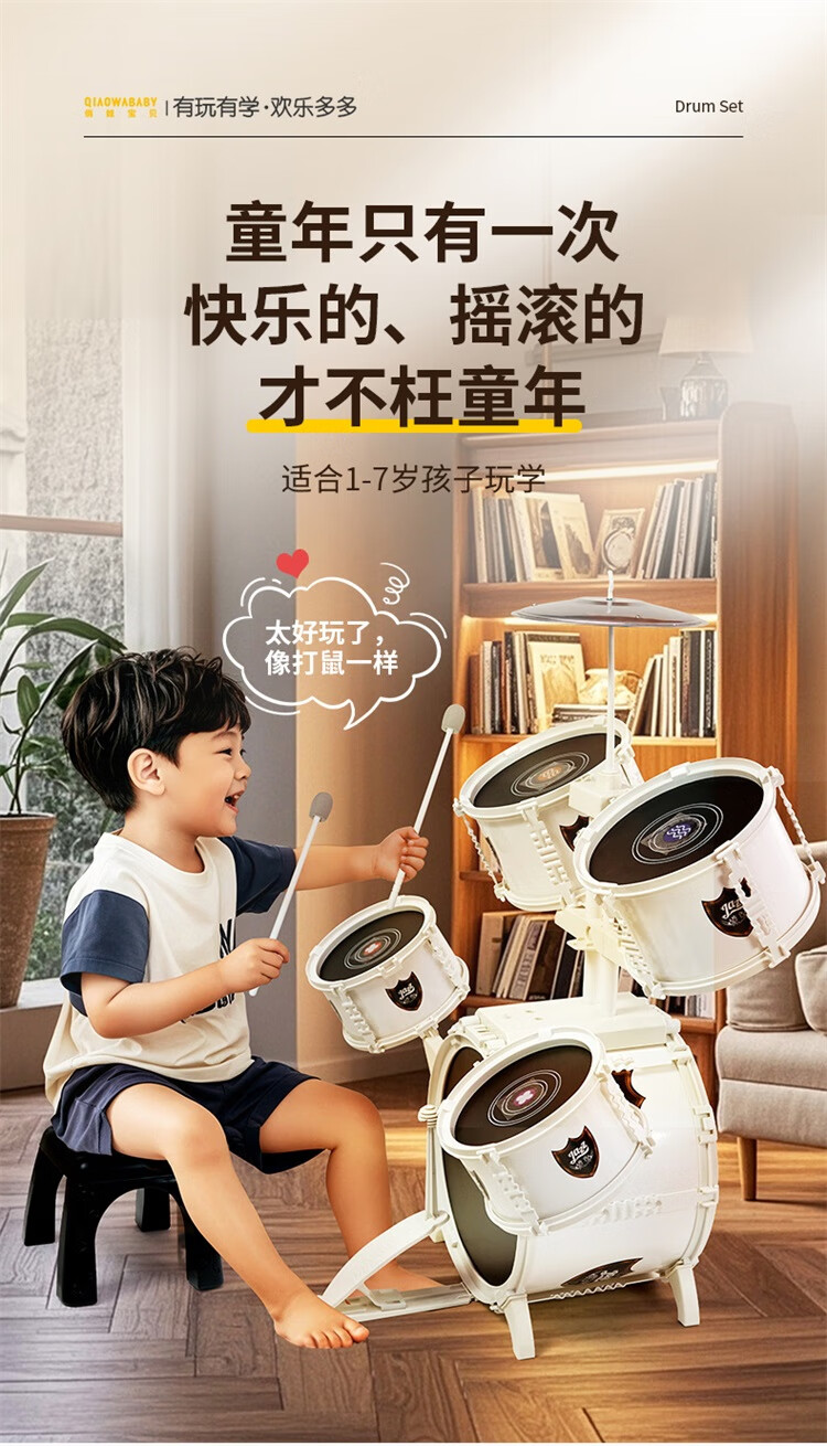 QIAO WA BAO BEI large platinum drum set children's toy for beginners 3-6 years old entry-level jazz drum drumming instrument birthday gift Christmas