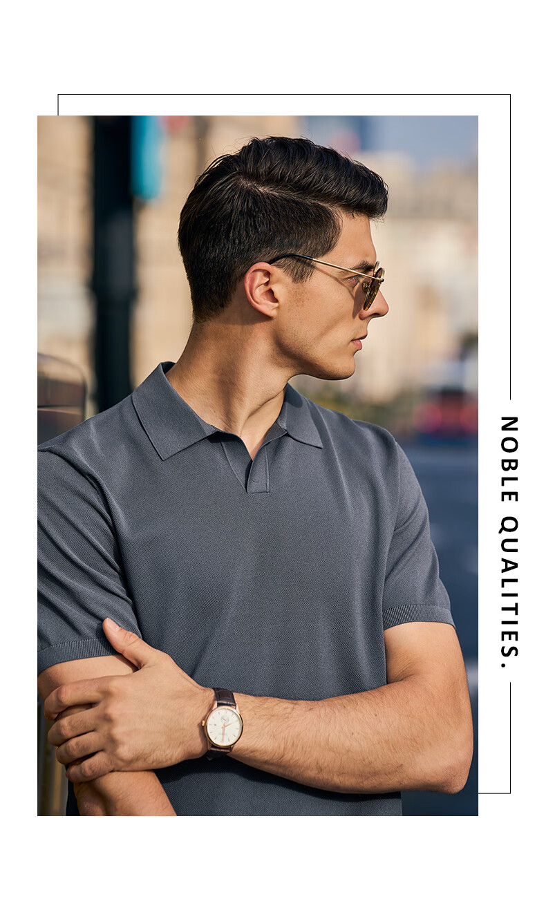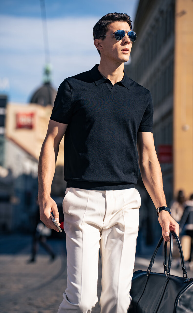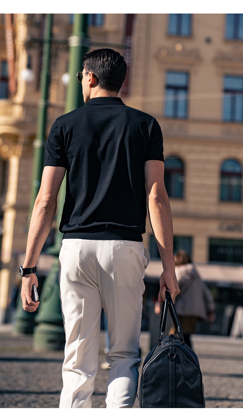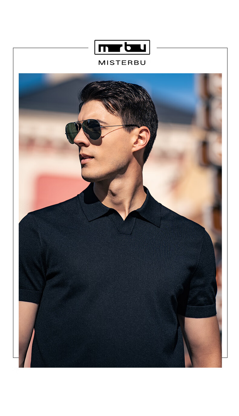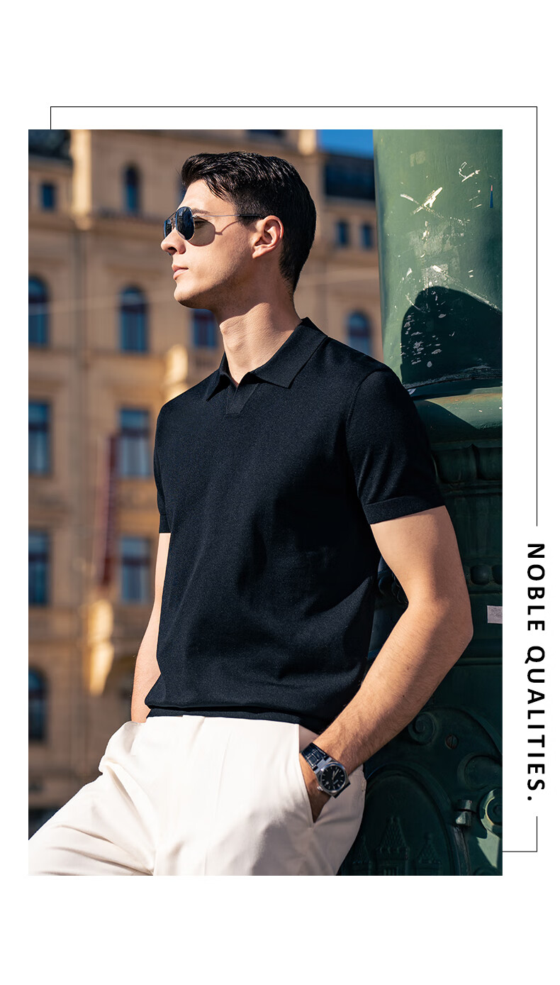 布先生翻领短袖羊毛t恤男时尚高级可机洗针织衫上衣 钢琴黑 L/175