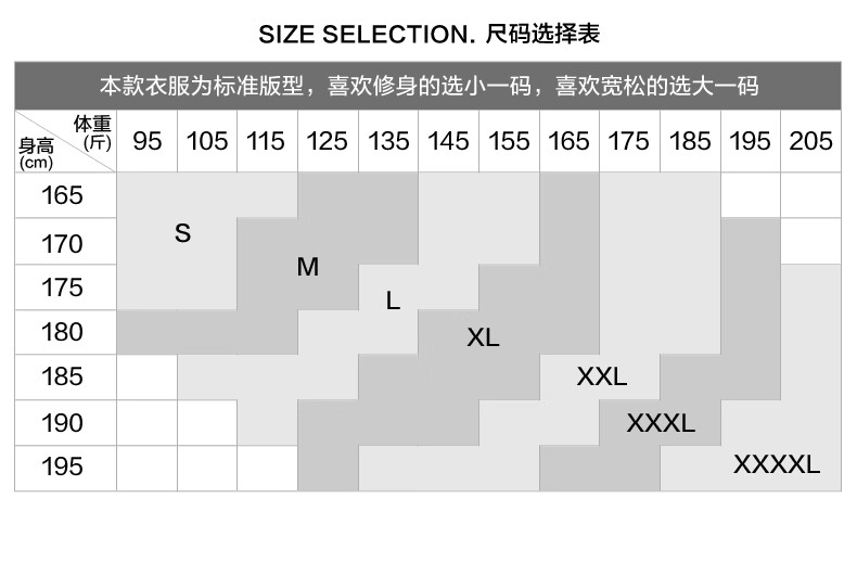 China (cm) 165 / 88-90 170 / 96-98 175 / 108-110 180 / 118-122 185 / 126-130
