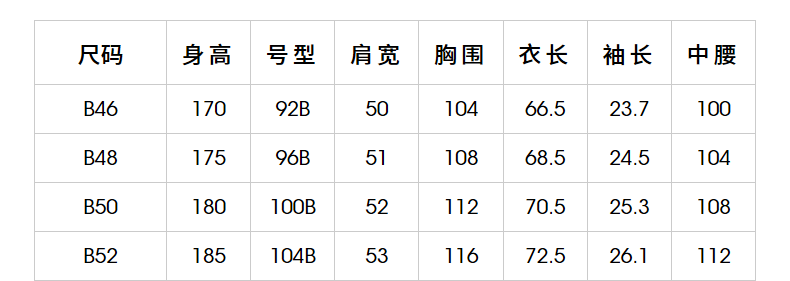 China (cm) 160-165/84-86 165-170 / 88-90 167-172 / 92-96 168-173 / 98-102 170-176 / 106-110