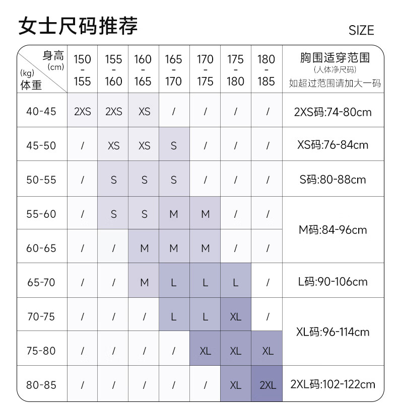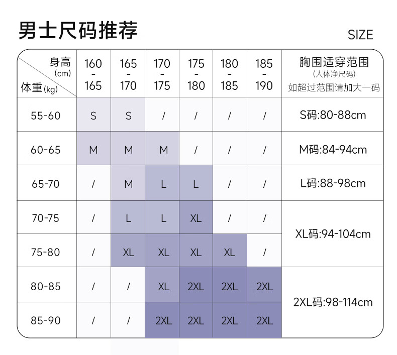 China (cm) 160-165/84-86 165-170 / 88-90 167-172 / 92-96 168-173 / 98-102 170-176 / 106-110