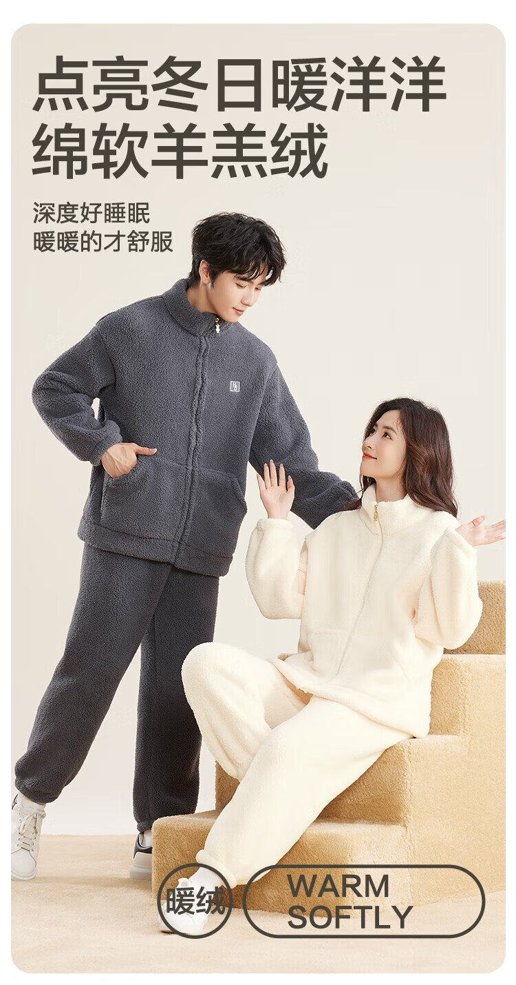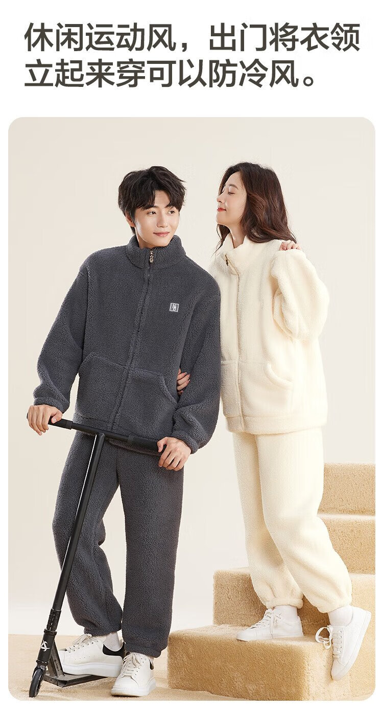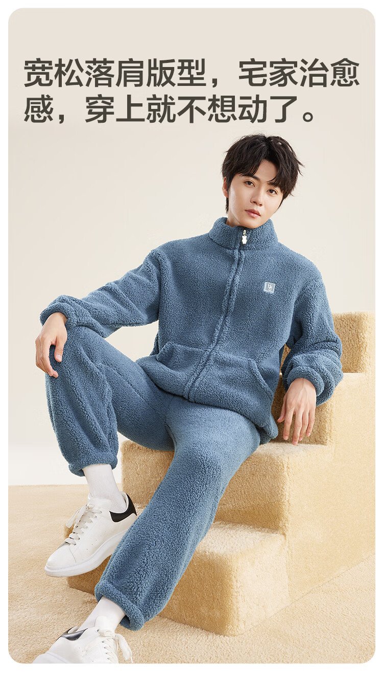 Red Bean Home Lamb Velvet Pajamas Men's Autumn and Winter Plus Velvet Thickened Cardigan Men's Home Clothes Zipper Style Monet Blue 175/96A