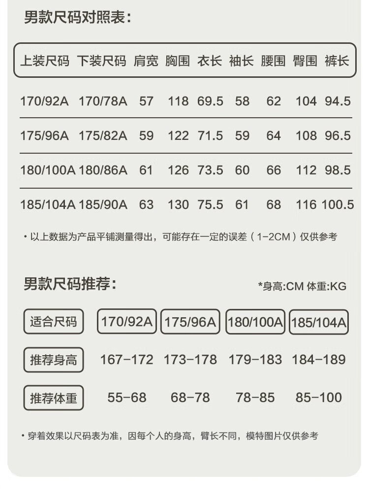 China (cm) 165 / 88-90 170 / 96-98 175 / 108-110 180 / 118-122 185 / 126-130
