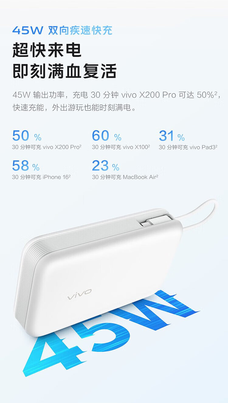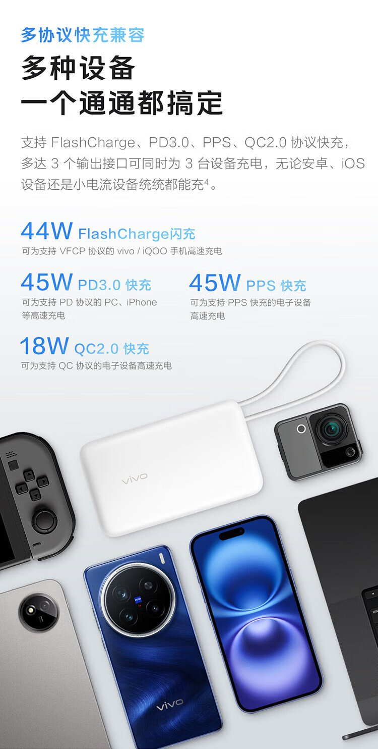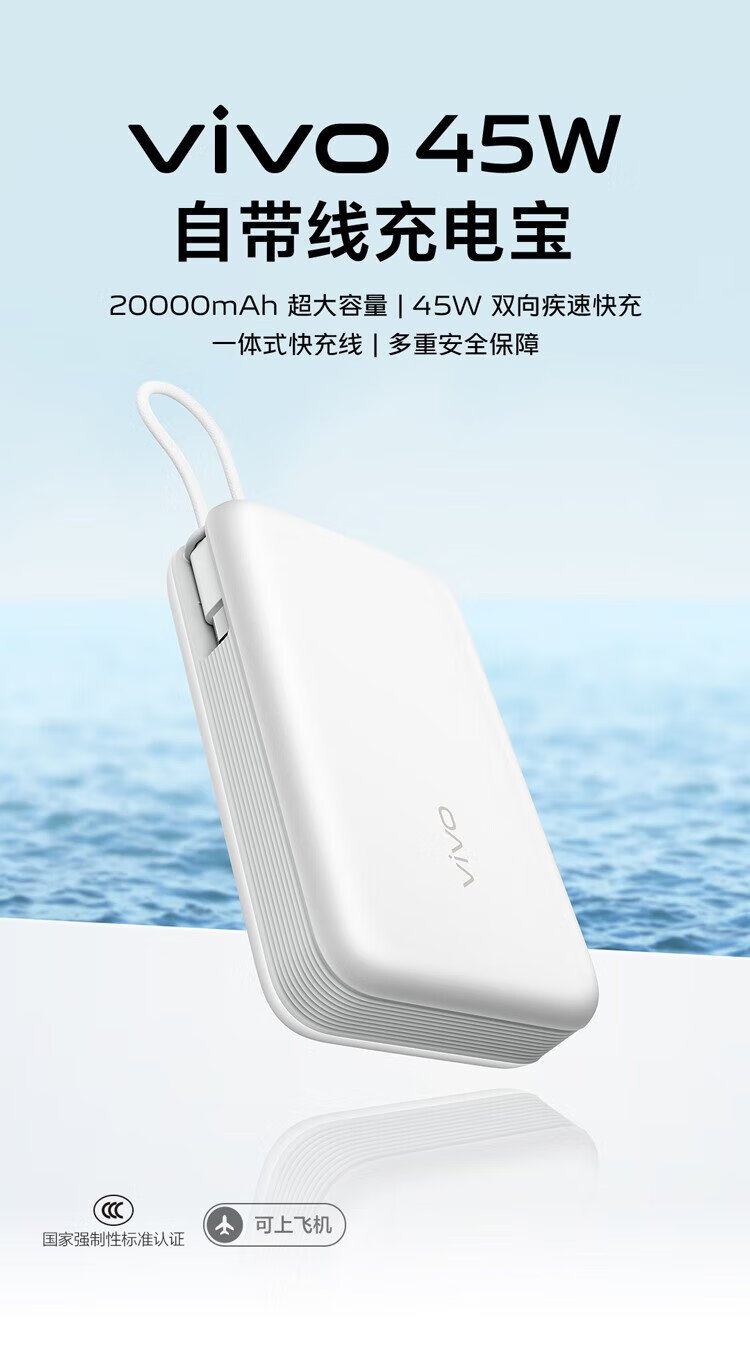 Vivo45W comes with a 20,000 mAh wired power bank. It is 3C certified and can be used on airplanes. It supports iPhone 17 fast charging and is compatible with Apple, Xiaomi, Huawei, OPPO iQOO.