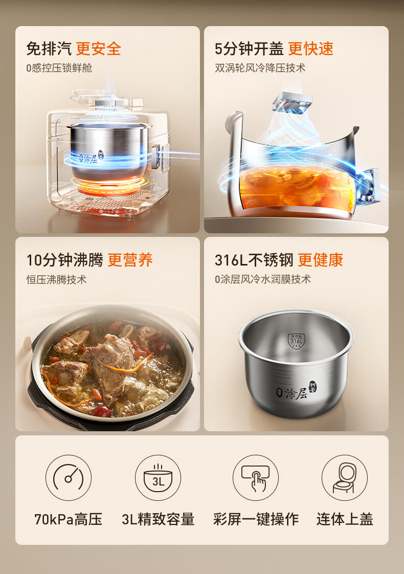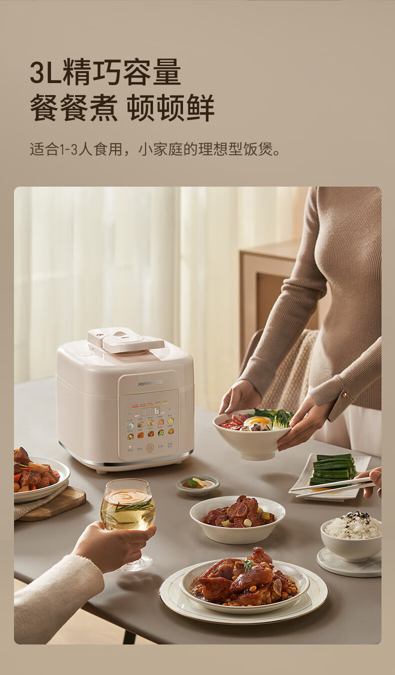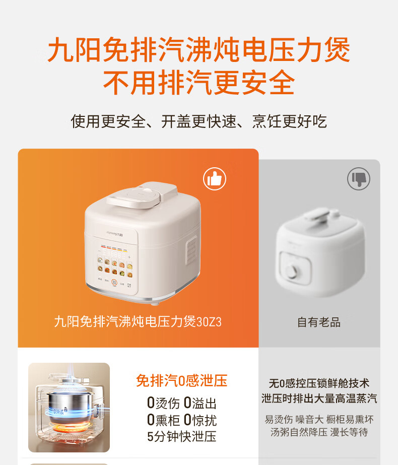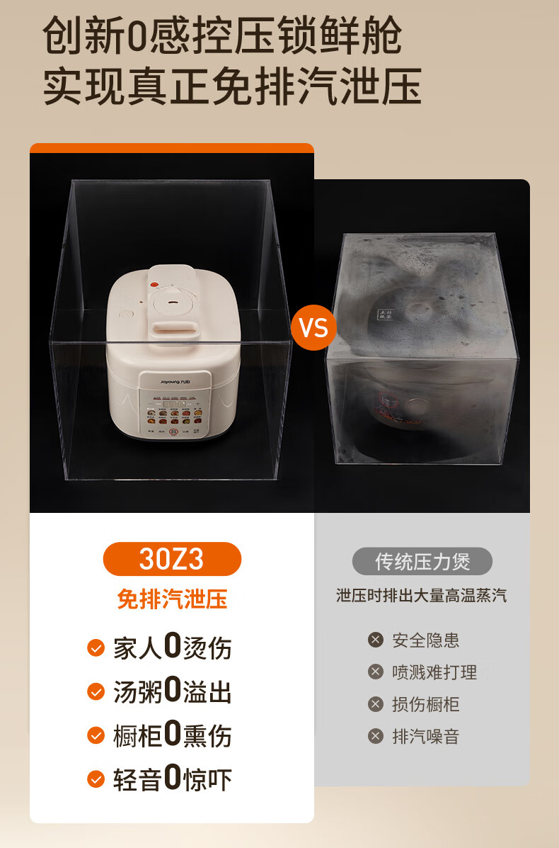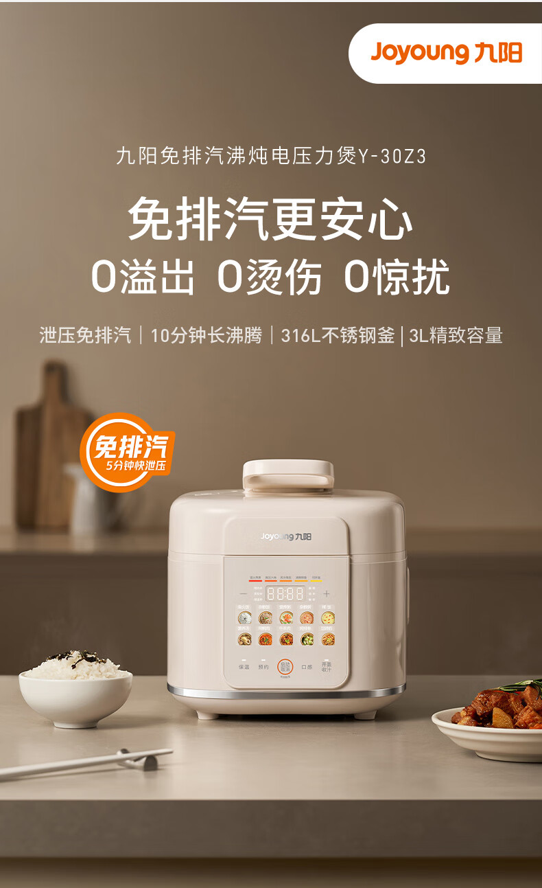 Joyoung 3L exhaust-free series electric pressure cooker small mini 1-3 people household smart reservation 0 coating 316 stainless steel inner pot rice cooker pressure cooker 30Z3