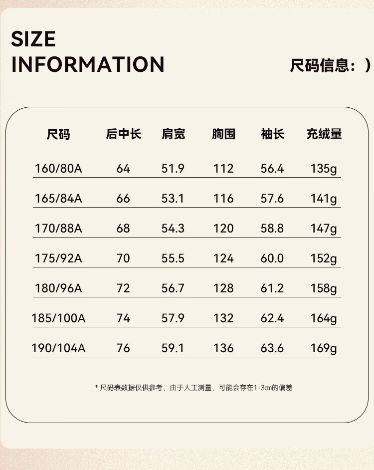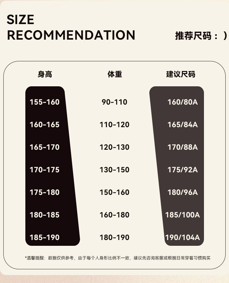 China (cm) 160-165/84-86 165-170 / 88-90 167-172 / 92-96 168-173 / 98-102 170-176 / 106-110