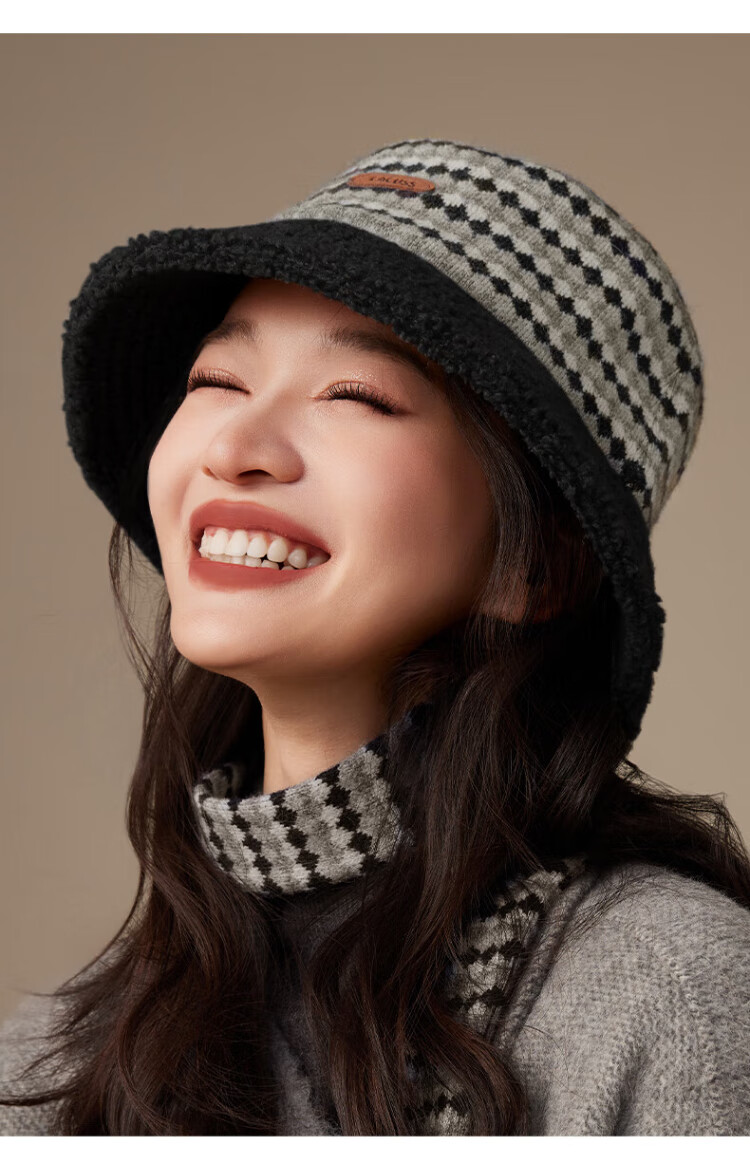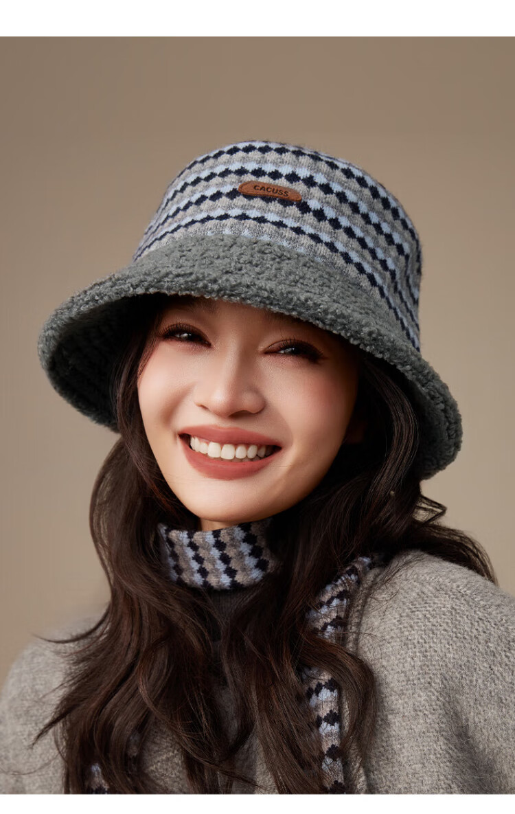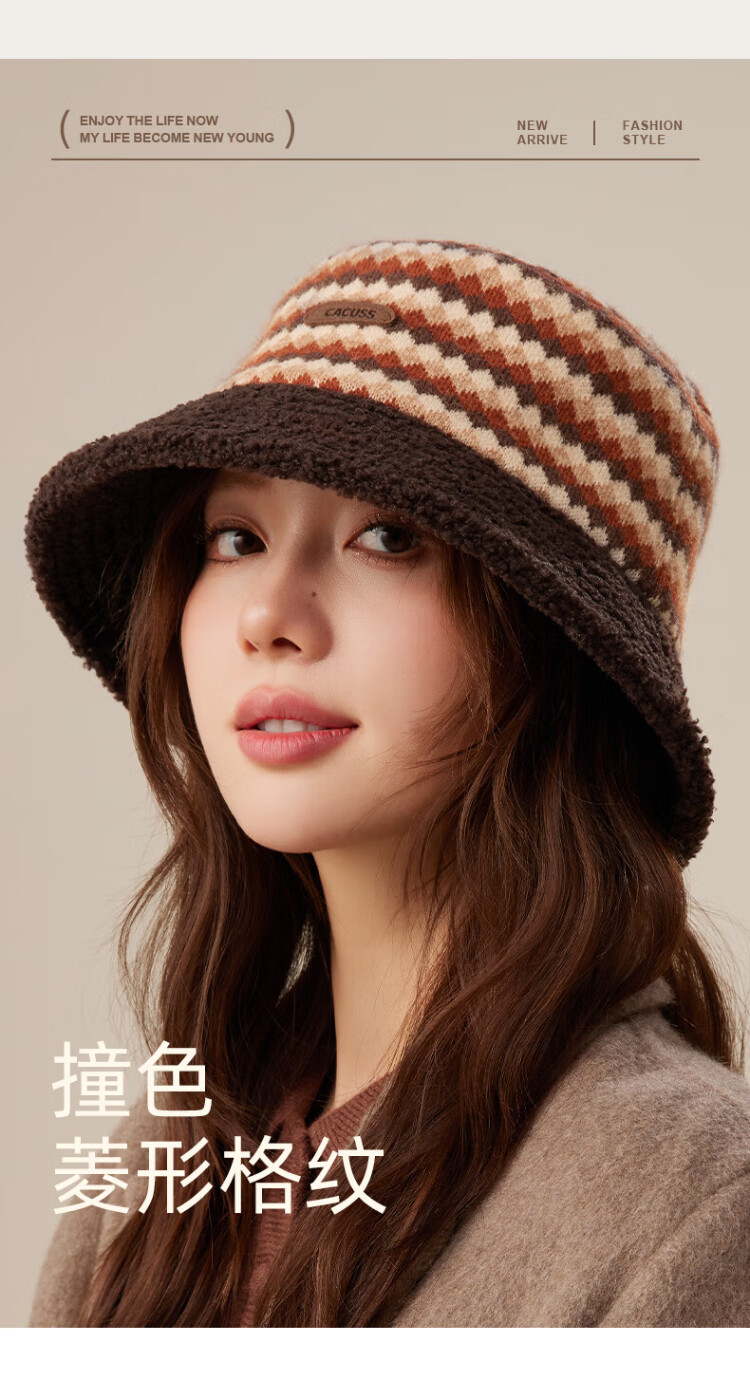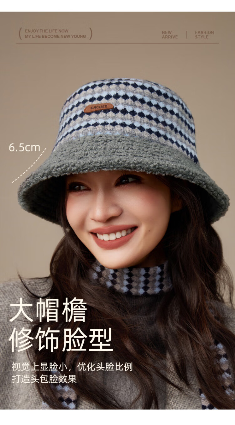 CACUSS Hat Women's Winter Warm Fisherman Hat Big Head Circumference Showing Face Small Basin Hat Retro Plaid Teddy Velvet Hat Coffee Color