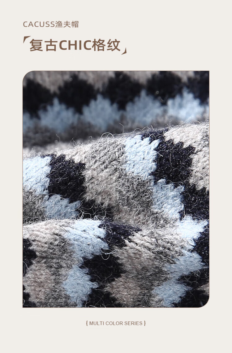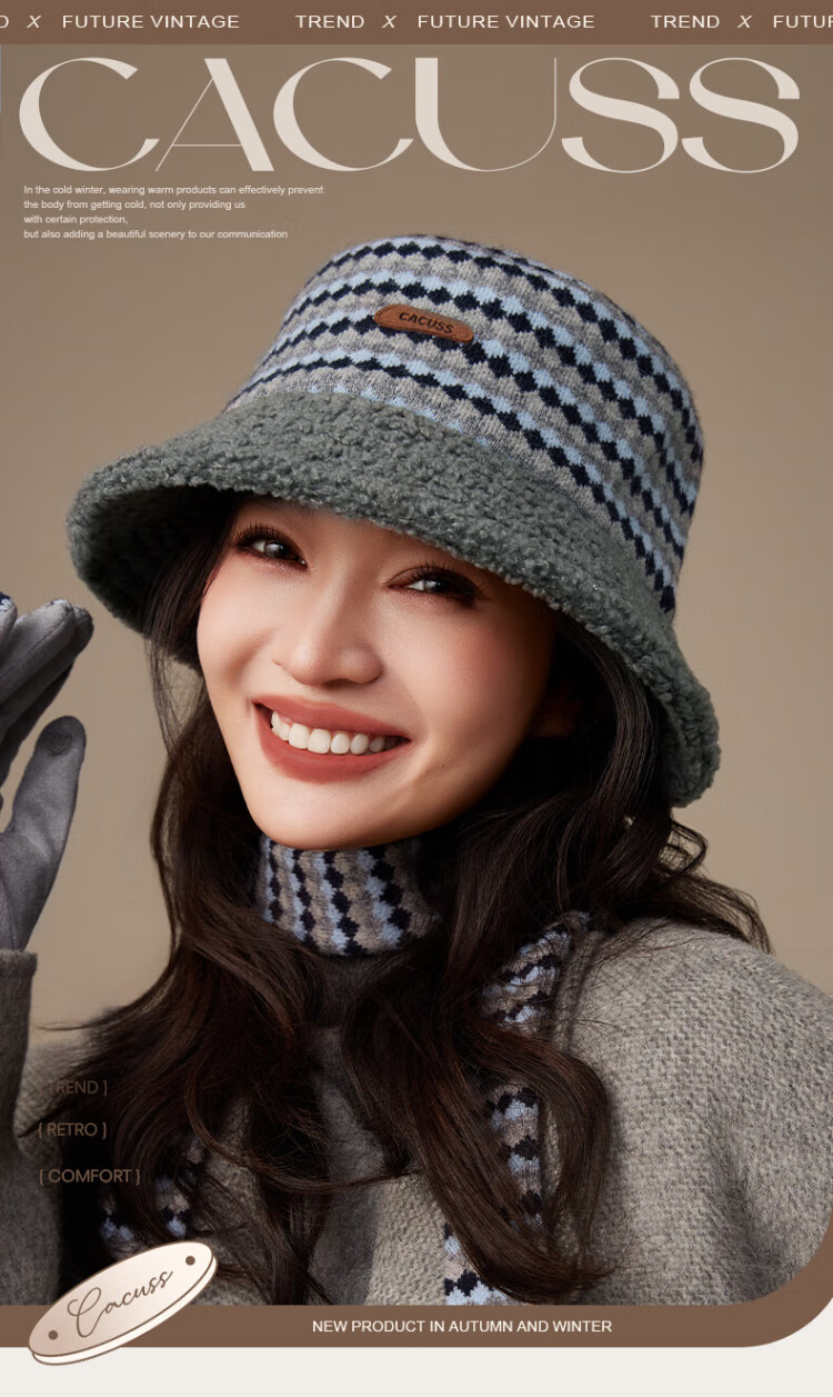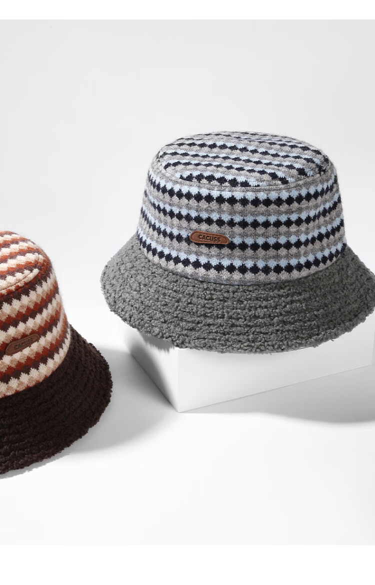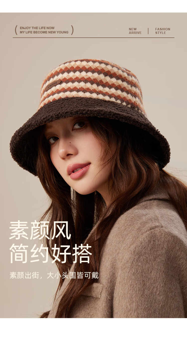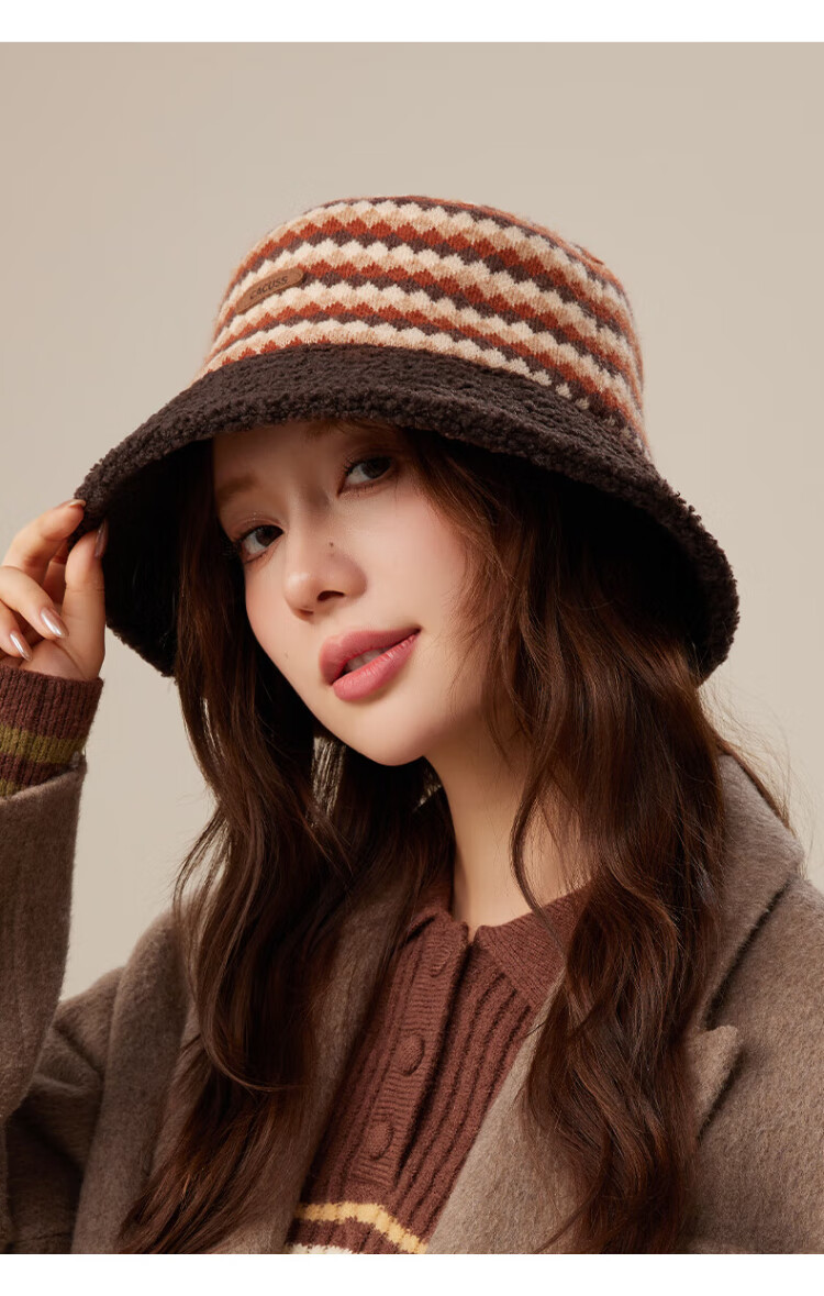 CACUSS Hat Women's Winter Warm Fisherman Hat Big Head Circumference Showing Face Small Basin Hat Retro Plaid Teddy Velvet Hat Coffee Color