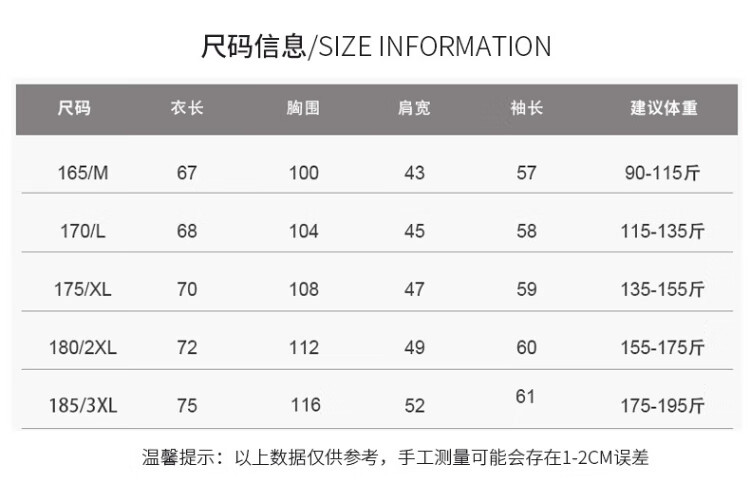China (cm) 165 / 88-90 170 / 96-98 175 / 108-110 180 / 118-122 185 / 126-130